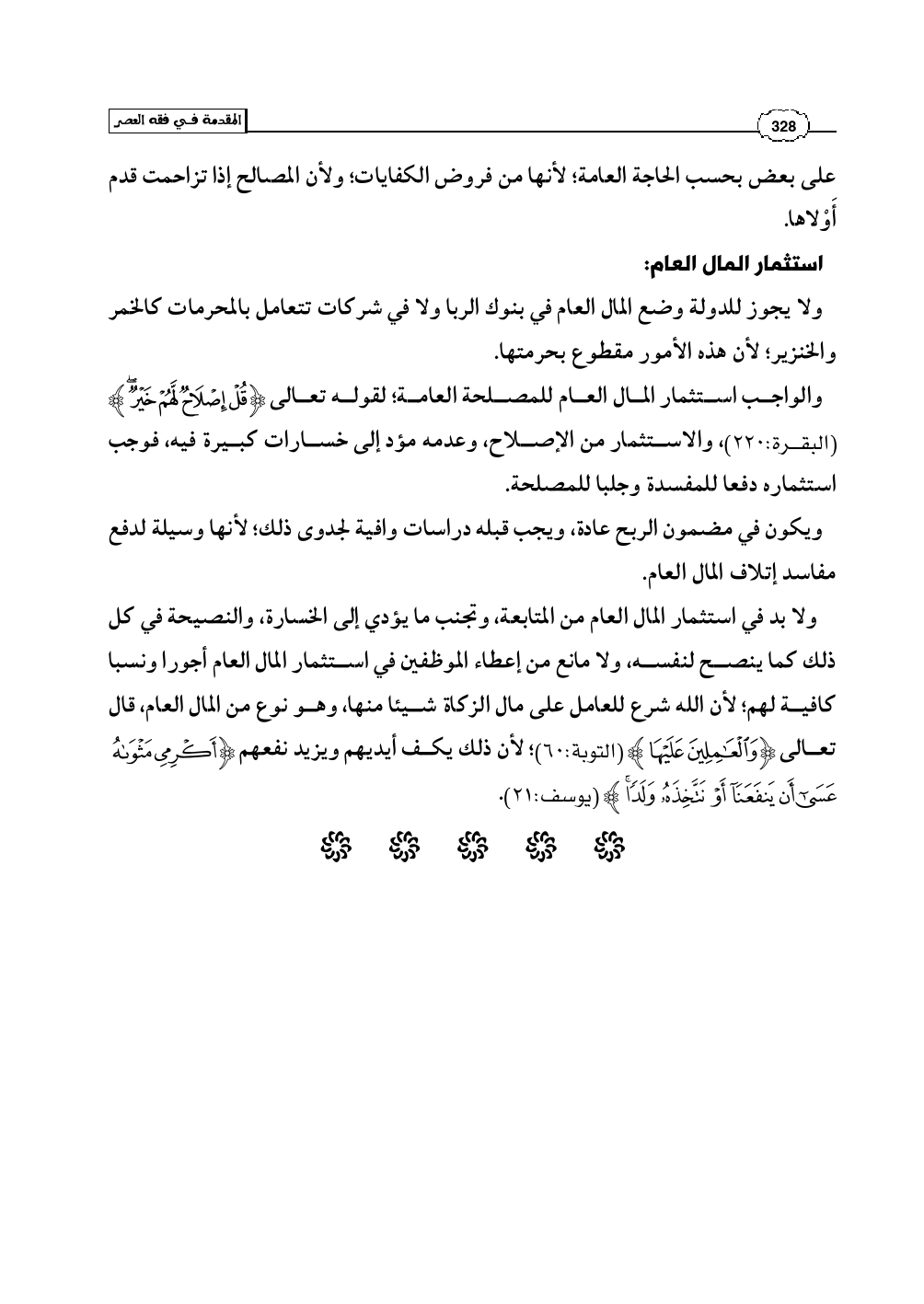 ولا بد في استثمار المال العام من المتابعة، وتجنب ما يؤدي إلى الخسارة، والنصيحة في كل ذلك كما ينصح لنفسه، ولا مانع من إعطاء الموظفين في استثمار المال العام أجورا ونسبا كافية لهم؛ لأن الله شرع للعامل على مال الزكاة شيئا منها، وهو نوع من المال العام، قال تعالى (وَالْعَامِلِينَ عَلَيْهَا) (التوبة: 60)؛ لأن ذلك يكف أيديهم ويزيد نفعهم (أَكْرِمِي مَثْوَاهُ عَسَى أَن يَنفَعَنَا أَوْ نَتَّخِذَهُ وَلَدًا) (يوسف: 21).