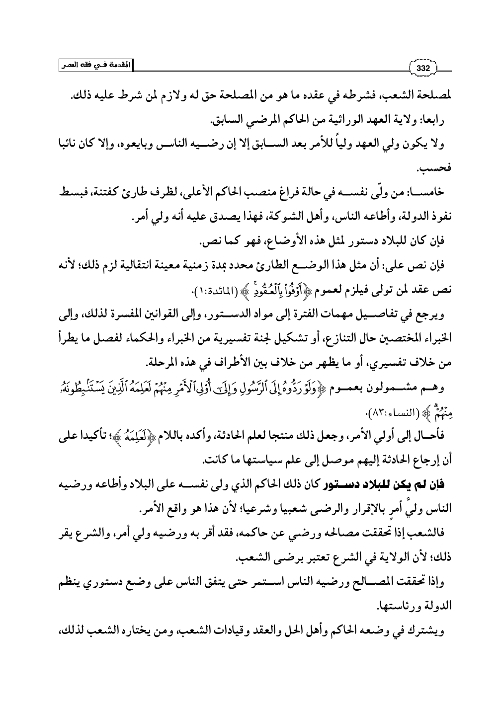 وإذا تحققت المصالح ورضيه الناس استمر حتى يتفق الناس على وضع دستوري ينظم الدولة ورئاستها.