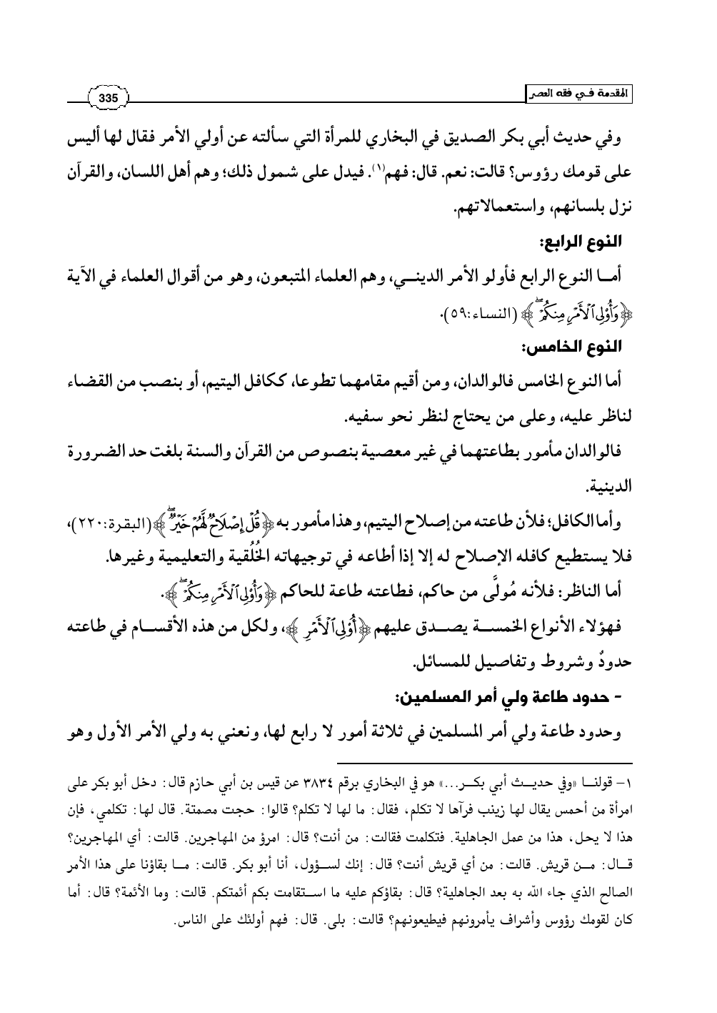 وفي حديث أبي بكر الصديق في البخاري للمرأة التي سألته عن أولي الأمر فقال لها أليس على قومك رؤوس؟ قالت: نعم. قال: فهم (¬1). فيدل على شمول ذلك؛ وهم أهل اللسان، والقرآن نزل بلسانهم، واستعمالاتهم.
