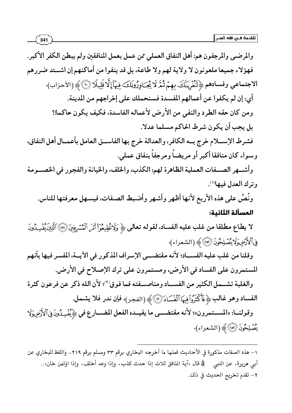 فشرط الإسلام خرج به الكافر، والعدالة خرج بها الفاسق العامل بأعمال أهل النفاق، وسواء كان منافقا أكبر أو مريضاً ومرجفاً بنفاق عملي.