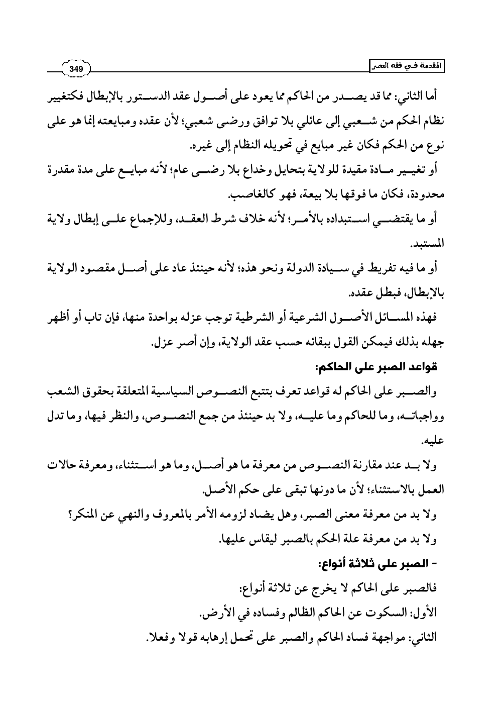 أما الثاني: مما قد يصدر من الحاكم مما يعود على أصول عقد الدستور بالإبطال فكتغيير نظام الحكم من شعبي إلى عائلي بلا توافق ورضى شعبي؛ لأن عقده ومبايعته إنما هو على نوع من الحكم فكان غير مبايع في تحويله النظام إلى غيره.