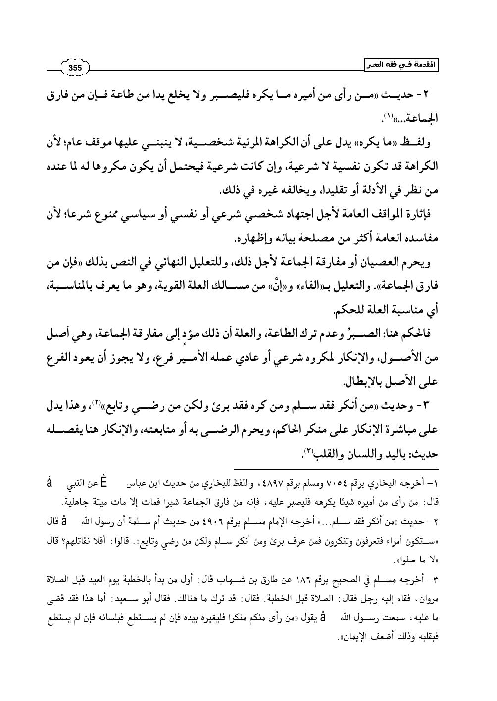 ويحرم العصيان أو مفارقة الجماعة لأجل ذلك، وللتعليل النهائي في النص بذلك «فإن من فارق الجماعة». والتعليل بـ «الفاء» و «إنَّ» من مسالك العلة القوية، وهو ما يعرف بالمناسبة، أي مناسبة العلة للحكم.