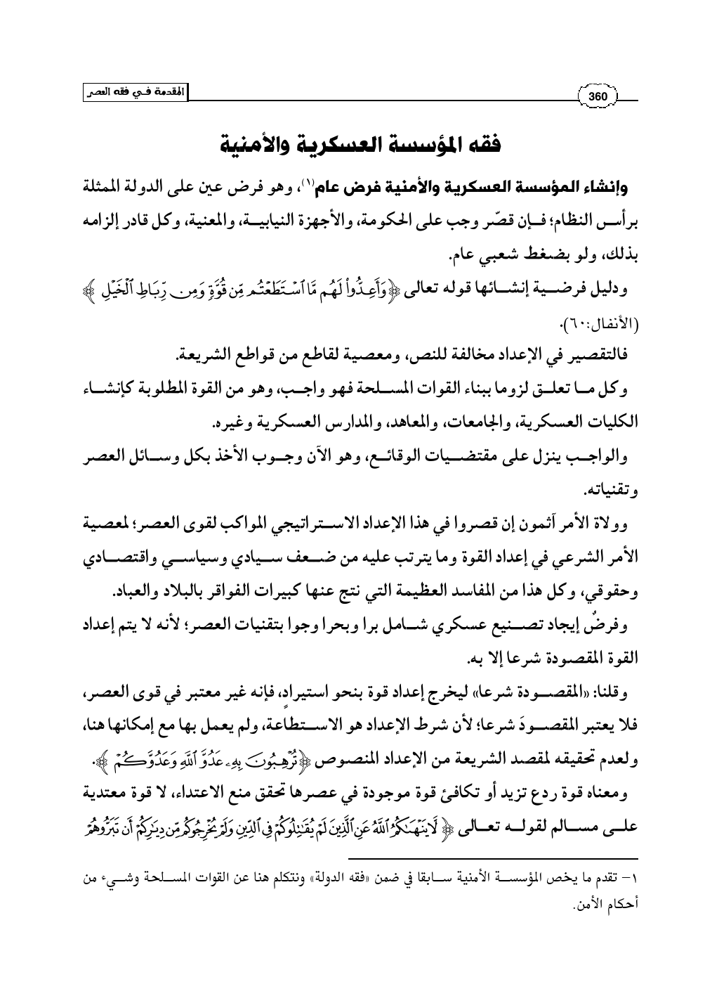 وإنشاء المؤسسة العسكرية والأمنية فرض عام (¬1)، وهو فرض عين على الدولة الممثلة برأس النظام؛ فإن قصّر وجب على الحكومة، والأجهزة النيابية، والمعنية، وكل قادر إلزامه بذلك، ولو بضغط شعبي عام.