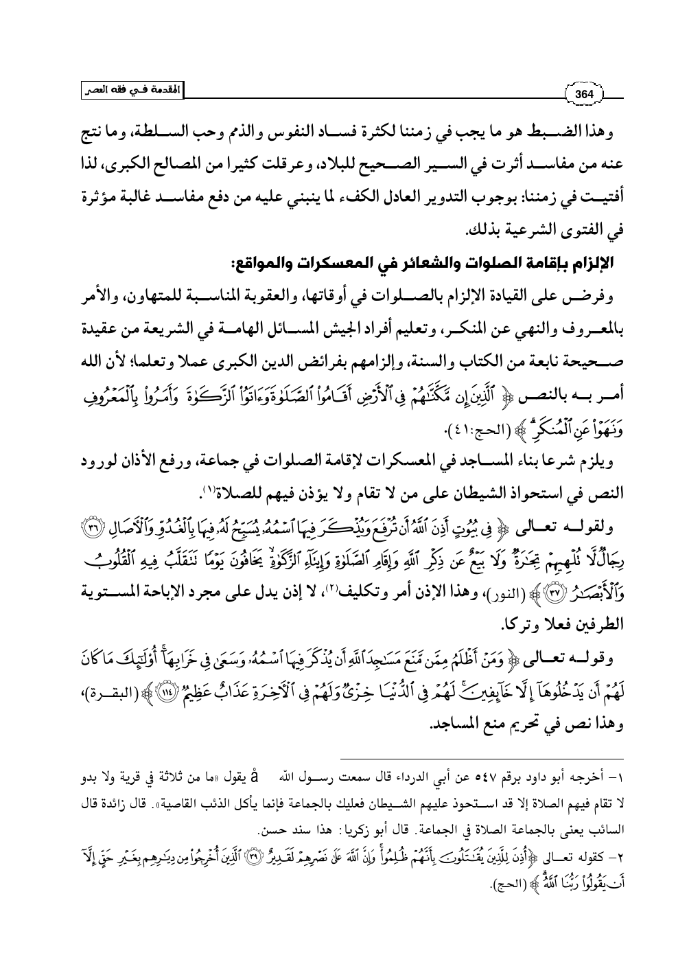 ويلزم شرعا بناء المساجد في المعسكرات لإقامة الصلوات في جماعة، ورفع الأذان لورود النص في استحواذ الشيطان على من لا تقام ولا يؤذن فيهم للصلاة (¬1).