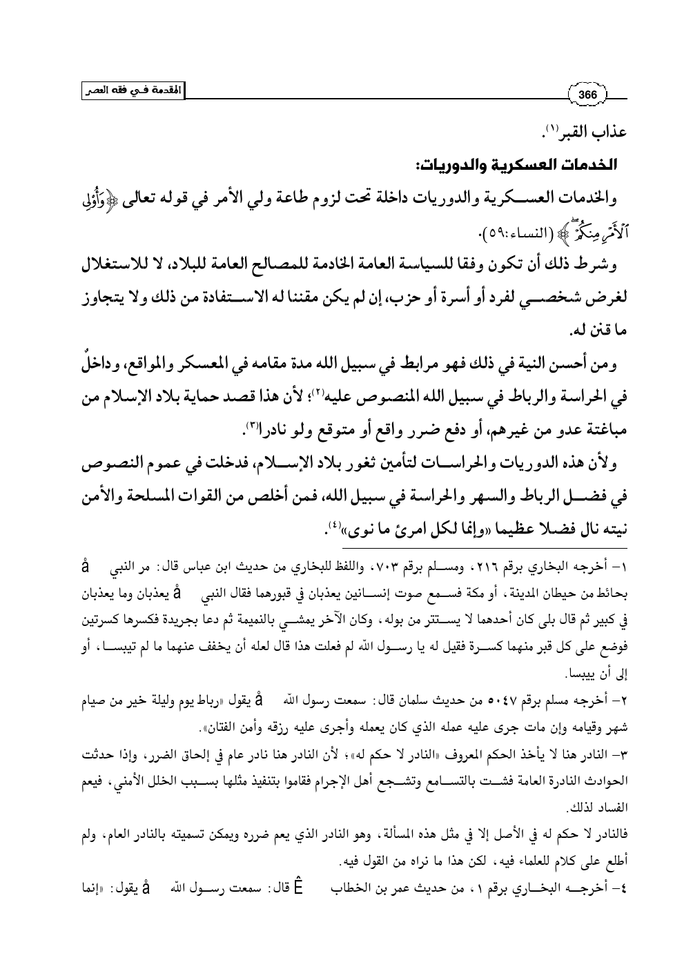 ومن أحسن النية في ذلك فهو مرابط في سبيل الله مدة مقامه في المعسكر والمواقع، وداخلٌ في الحراسة والرباط في سبيل الله المنصوص عليه (¬2)؛ لأن هذا قصد حماية بلاد الإسلام من مباغتة عدو من غيرهم، أو دفع ضرر واقع أو متوقع ولو نادرا (¬3).