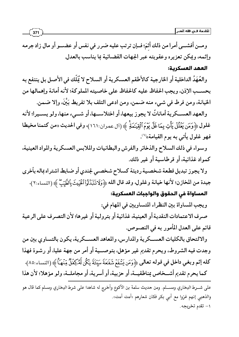والعهد العسكرية أماناتٌ لا يجوز بيعها، أو اختلاسها، أو شيء منها، ولو يسيرا؛ لأنه غلول (وَمَن يَغْلُلْ يَأْتِ بِمَا غَلَّ يَوْمَ الْقِيَامَةِ) (آل عمران: 161)، وفي الحديث «من كتمنا مخيطا فهو غلول يأتي به يوم القيامة» (¬1).