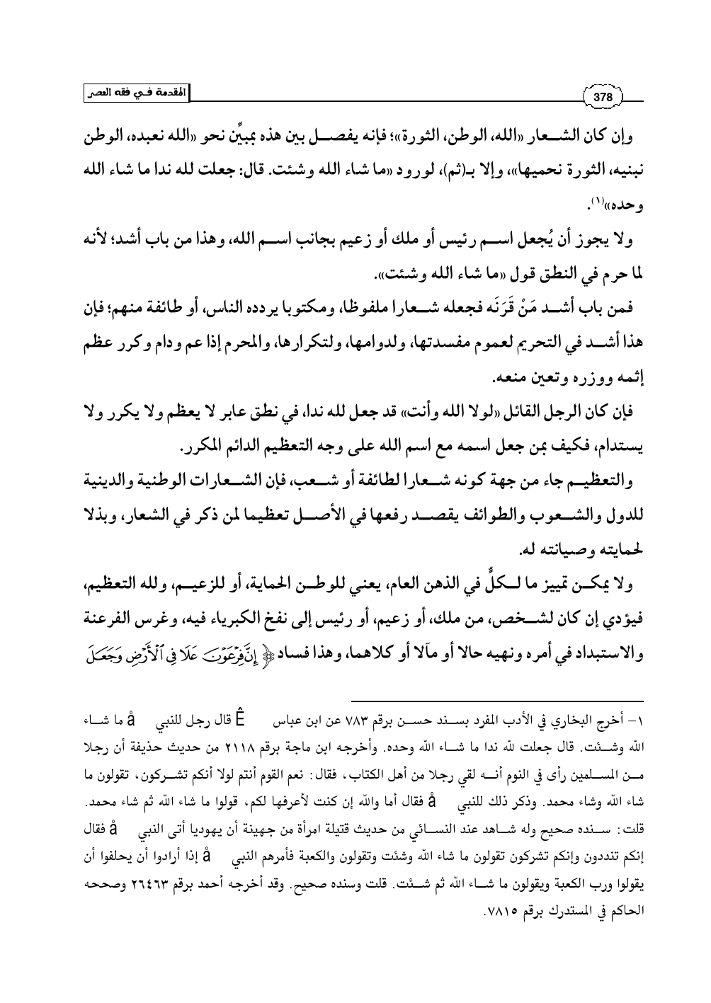 وإن كان الشعار «الله، الوطن، الثورة»؛ فإنه يفصل بين هذه بمبيِّن نحو «الله نعبده، الوطن نبنيه، الثورة نحميها»، وإلا بـ (ثم)، لورود «ما شاء الله وشئت. قال: جعلت لله ندا ما شاء الله وحده» (¬1).