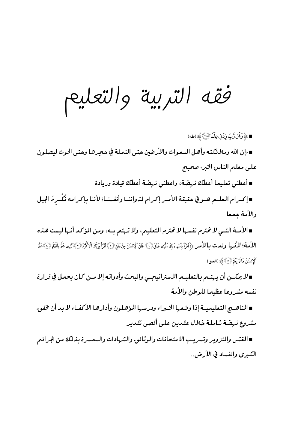 * الأمة التي لا تحترم نفسها لا تحترم التعليم، ولا تهتم به، ومن المؤكد أنها ليست هذه الأمة؛ لأنها ولدت بالأمر (اقْرَأْ بِاسْمِ رَبِّكَ الَّذِي خَلَقَ* خَلَقَ الإِنسَانَ مِنْ عَلَقٍ* اقْرَأْ وَرَبُّكَ الأَكْرَمُ* الَّذِي عَلَّمَ بِالْقَلَمِ* عَلَّمَ الإِنسَانَ مَا لَمْ يَعْلَمْ) (العلق: 1 - 5)