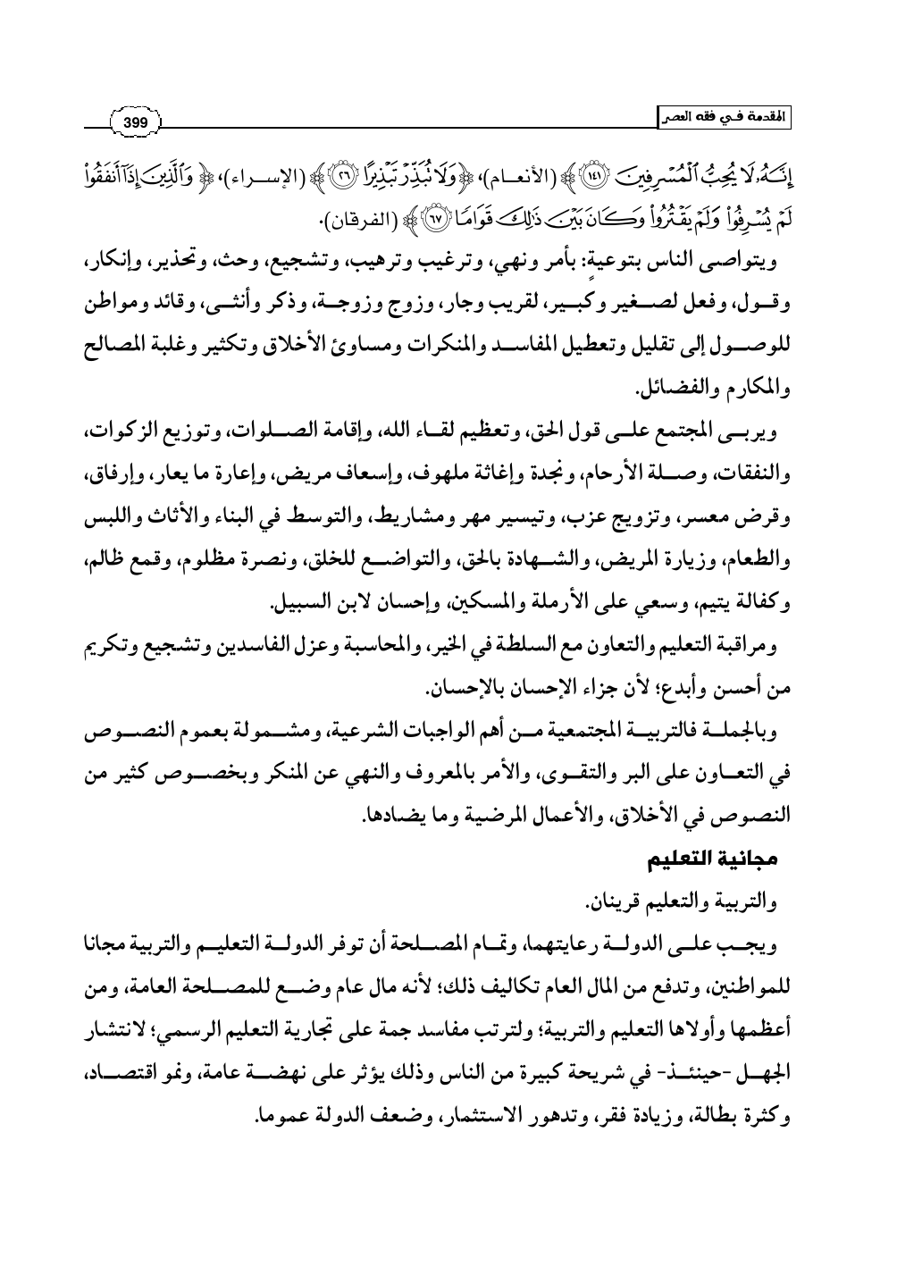 إِنَّهُ لاَ يُحِبُّ الْمُسْرِفِينَ) (الأنعام: 141)، (وَلاَ تُبَذِّرْ تَبْذِيرًا) (الإسراء: 26)، (وَالَّذِينَ إِذَا أَنفَقُوا لَمْ يُسْرِفُوا وَلَمْ يَقْتُرُوا وَكَانَ بَيْنَ ذَلِكَ قَوَامًا) (الفرقان: 67).