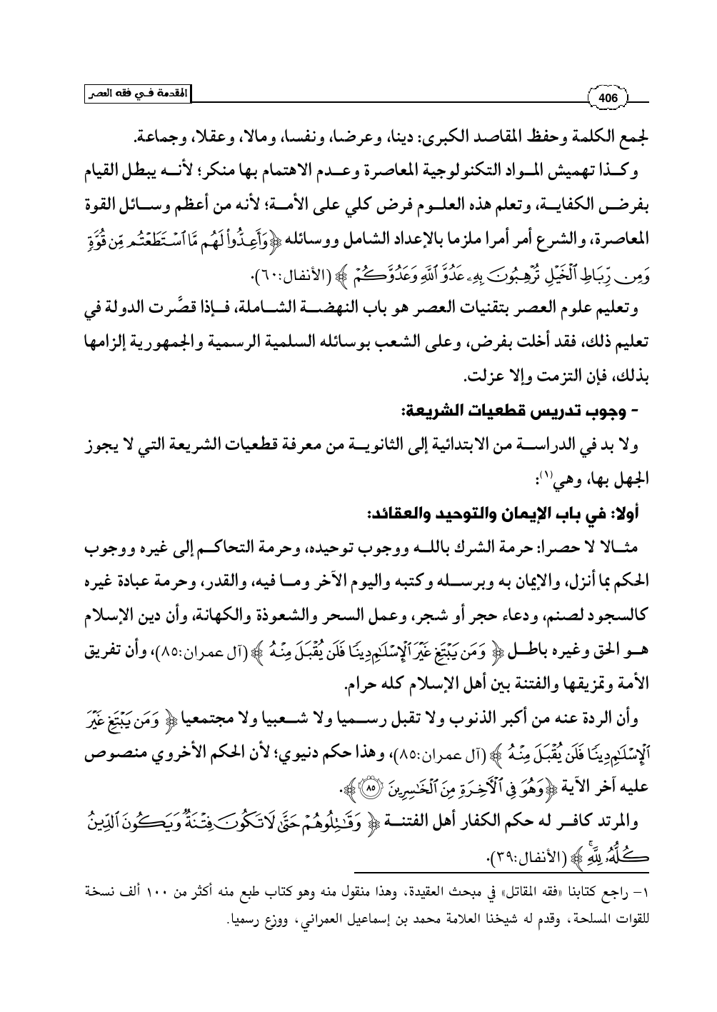 (¬1) - راجع كتابنا «فقه المقاتل» في مبحث العقيدة، وهذا منقول منه وهو كتاب طبع منه أكثر من 100 ألف نسخة للقوات المسلحة، وقدم له شيخنا العلامة محمد بن إسماعيل العمراني، ووزع رسميا.
