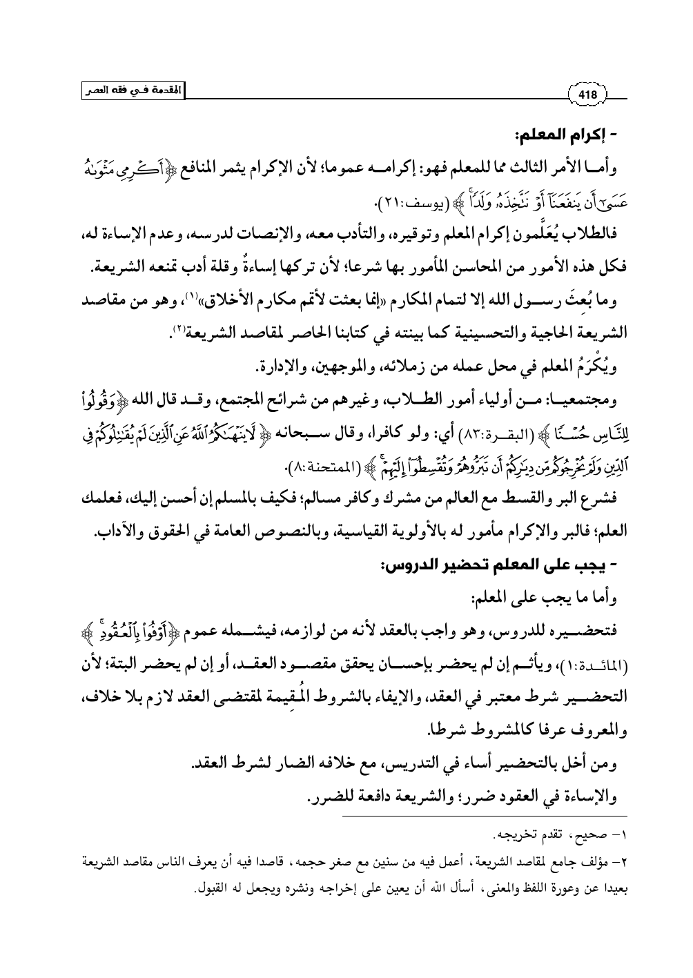 فتحضيره للدروس، وهو واجب بالعقد لأنه من لوازمه، فيشمله عموم (أَوْفُوا بِالْعُقُودِ) (المائدة: 1)، ويأثم إن لم يحضر بإحسان يحقق مقصود العقد، أو إن لم يحضر البتة؛ لأن التحضير شرط معتبر في العقد، والإيفاء بالشروط المُقِيمة لمقتضى العقد لازم بلا خلاف، والمعروف عرفا كالمشروط شرطا.