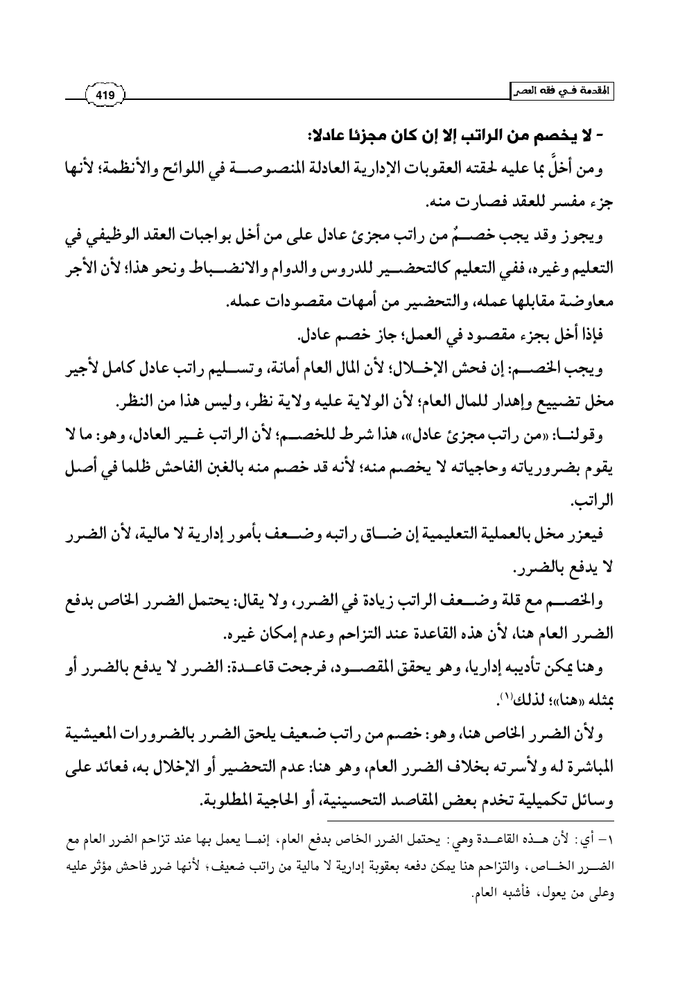 (¬1) - أي: لأن هذه القاعدة وهي: يحتمل الضرر الخاص بدفع العام، إنما يعمل بها عند تزاحم الضرر العام مع الضرر الخاص، والتزاحم هنا يمكن دفعه بعقوبة إدارية لا مالية من راتب ضعيف؛ لأنها ضرر فاحش مؤثر عليه وعلى من يعول، فأشبه العام.