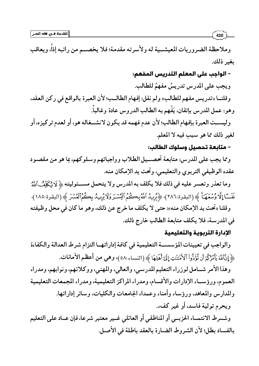 وقلنا «تدريس مفهم للطالب» ولم نقل: إفهام الطالب؛ لأن العبرة بالواقع في ركن العقد، وهو: عمل المدرس بإتقان، يَفْهم به الطالب الدروس عادة وغالباً.