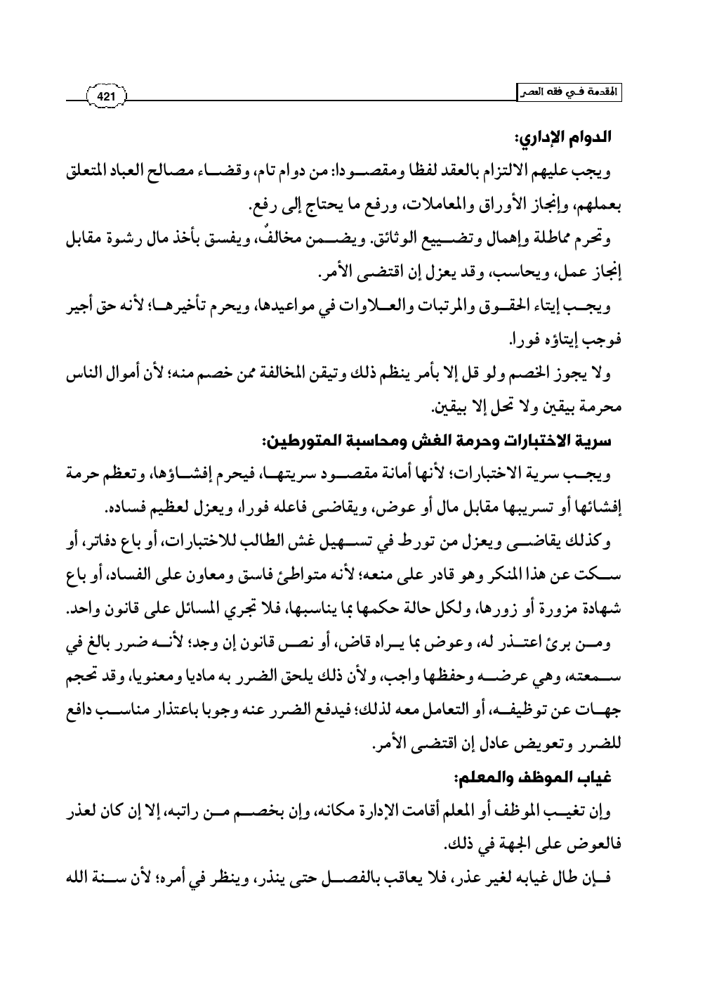ويجب عليهم الالتزام بالعقد لفظا ومقصودا: من دوام تام، وقضاء مصالح العباد المتعلق بعملهم، وإنجاز الأوراق والمعاملات، ورفع ما يحتاج إلى رفع.