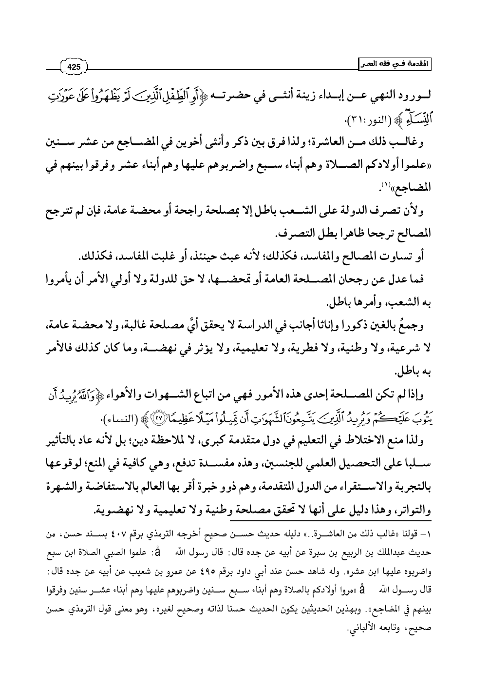 (¬1) - قولنا «غالب ذلك من العاشرة .. » دليله حديث حسن صحيح أخرجه الترمذي برقم 407 بسند حسن، من حديث عبدالملك بن الربيع بن سبرة عن أبيه عن جده قال: قال رسول الله صلى الله عليه وسلم: علموا الصبي الصلاة ابن سبع واضربوه عليها ابن عشر». وله شاهد حسن عند أبي داود برقم 495 عن عمرو بن شعيب عن أبيه عن جده قال: قال رسول الله صلى الله عليه وسلم «مروا أولادكم بالصلاة وهم أبناء سبع سنين واضربوهم عليها وهم أبناء عشر سنين وفرقوا بينهم في المضاجع». وبهذين الحديثين يكون الحديث حسنا لذاته وصحيح لغيره، وهو معنى قول الترمذي حسن صحيح، وتابعه الألباني.