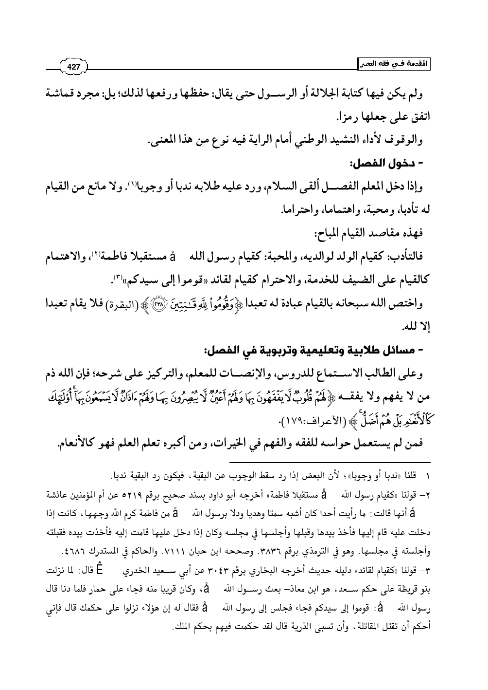 وإذا دخل المعلم الفصل ألقى السلام، ورد عليه طلابه ندبا أو وجوبا (¬1). ولا مانع من القيام له تأدبا، ومحبة، واهتماما، واحتراما.