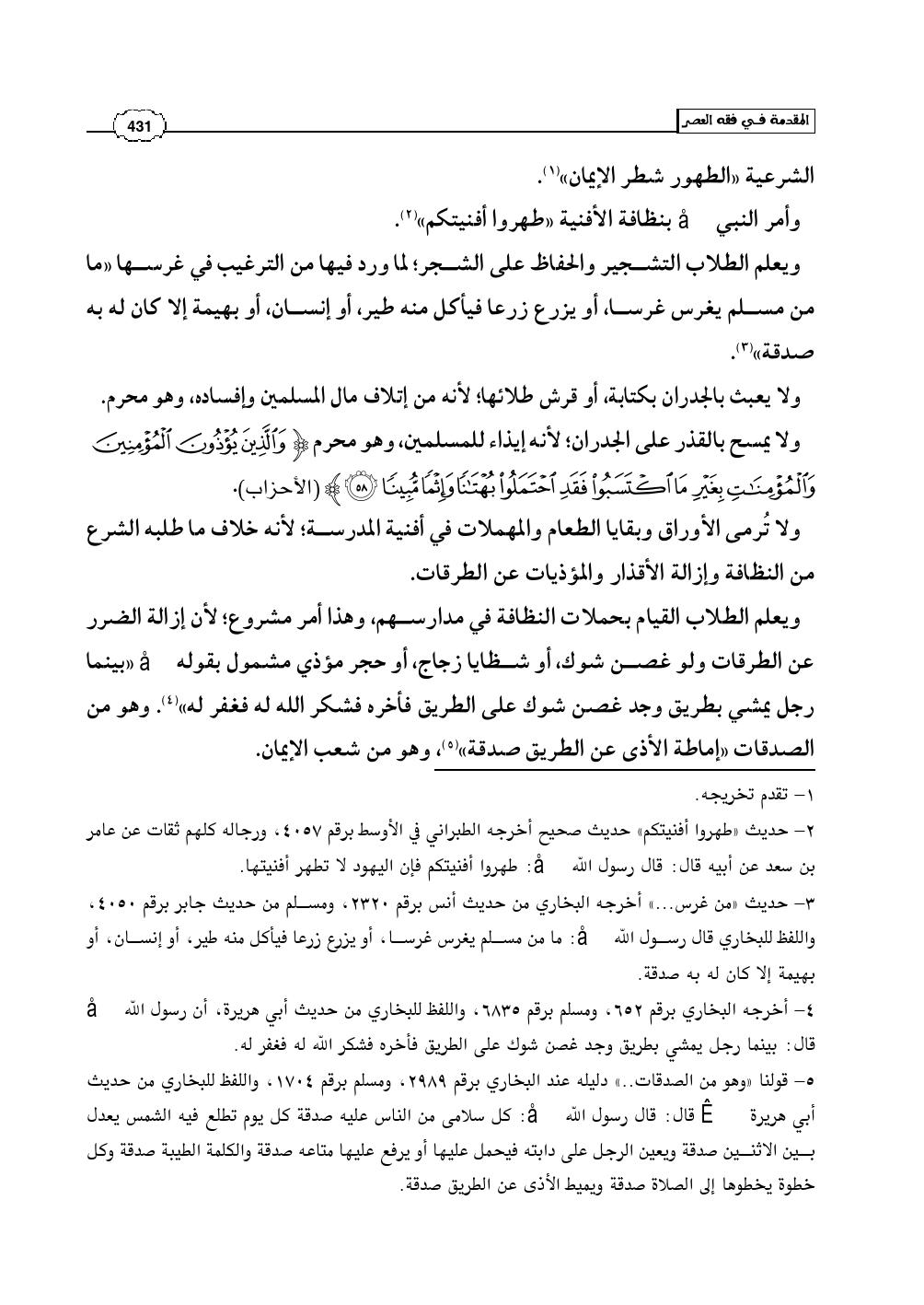 ويعلم الطلاب القيام بحملات النظافة في مدارسهم، وهذا أمر مشروع؛ لأن إزالة الضرر عن الطرقات ولو غصن شوك، أو شظايا زجاج، أو حجر مؤذي مشمول بقوله صلى الله عليه وسلم «بينما رجل يمشي بطريق وجد غصن شوك على الطريق فأخره فشكر الله له فغفر له» (¬4). وهو من الصدقات «إماطة الأذى عن الطريق صدقة» (¬5)، وهو من شعب الإيمان.