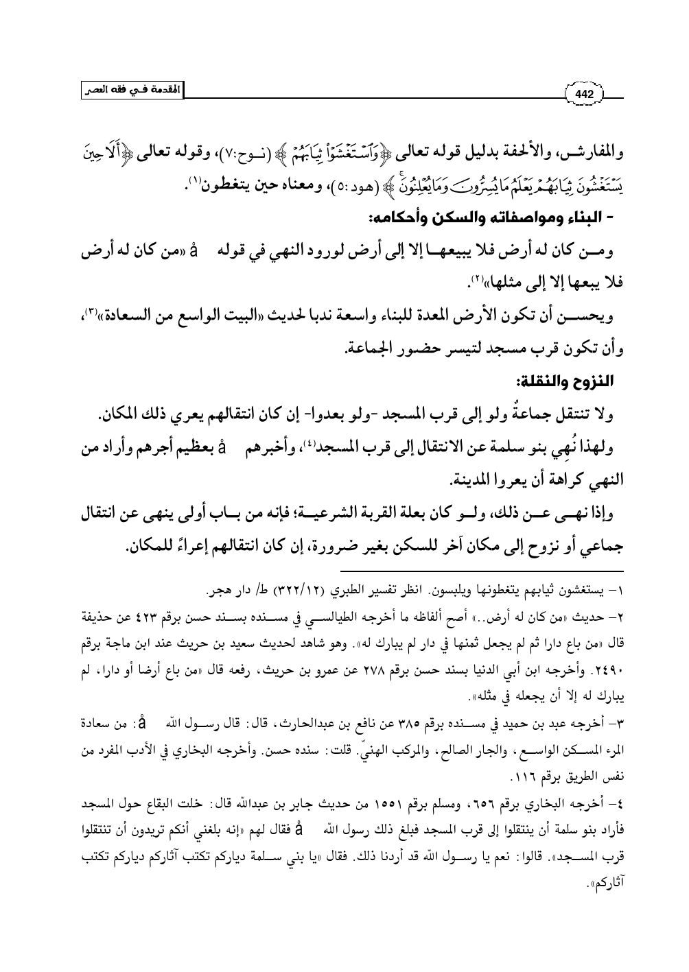 (¬4) - أخرجه البخاري برقم 656، ومسلم برقم 1551 من حديث جابر بن عبدالله قال: خلت البقاع حول المسجد فأراد بنو سلمة أن ينتقلوا إلى قرب المسجد فبلغ ذلك رسول الله صلى الله عليه وسلم فقال لهم «إنه بلغني أنكم تريدون أن تنتقلوا قرب المسجد». قالوا: نعم يا رسول الله قد أردنا ذلك. فقال «يا بني سلمة دياركم تكتب آثاركم دياركم تكتب آثاركم».