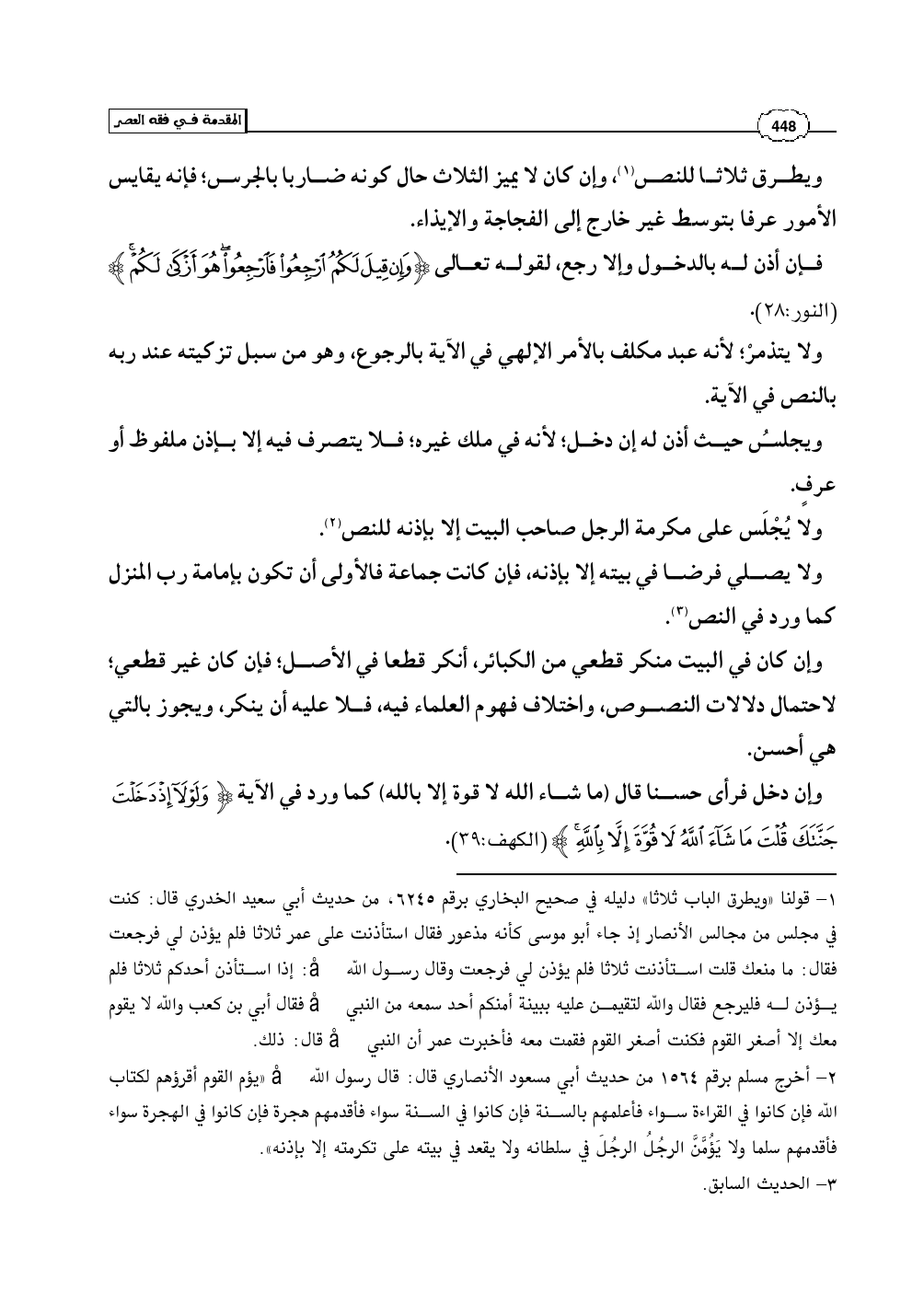 (¬1) - قولنا «ويطرق الباب ثلاثا» دليله في صحيح البخاري برقم 6245، من حديث أبي سعيد الخدري قال: كنت في مجلس من مجالس الأنصار إذ جاء أبو موسى كأنه مذعور فقال استأذنت على عمر ثلاثا فلم يؤذن لي فرجعت فقال: ما منعك قلت استأذنت ثلاثا فلم يؤذن لي فرجعت وقال رسول الله صلى الله عليه وسلم: إذا استأذن أحدكم ثلاثا فلم يؤذن له فليرجع فقال والله لتقيمن عليه ببينة أمنكم أحد سمعه من النبي صلى الله عليه وسلم فقال أبي بن كعب والله لا يقوم معك إلا أصغر القوم فكنت أصغر القوم فقمت معه فأخبرت عمر أن النبي صلى الله عليه وسلم قال: ذلك.