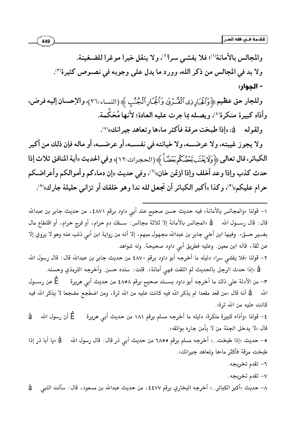 (¬1) - قولنا «والمجالس بالأمانة» فيه حديث حسن صحيح عند أبي داود برقم 4871، من حديث جابر بن عبدالله قال: قال رسول الله صلى الله عليه وسلم «المجالس بالأمانة إلا ثلاثة مجالس: سفك دم حرام، أو فرج حرام، أو اقتطاع مال بغير حق». وفيها ابن أخي جابر بن عبدالله مجهول مبهم، إلا أنه من رواية ابن أبي ذئب عنه وهو لا يروي إلا عن ثقة، قاله ابن معين. وعليه فطريق أبي داود صحيحة. وله شواهد.