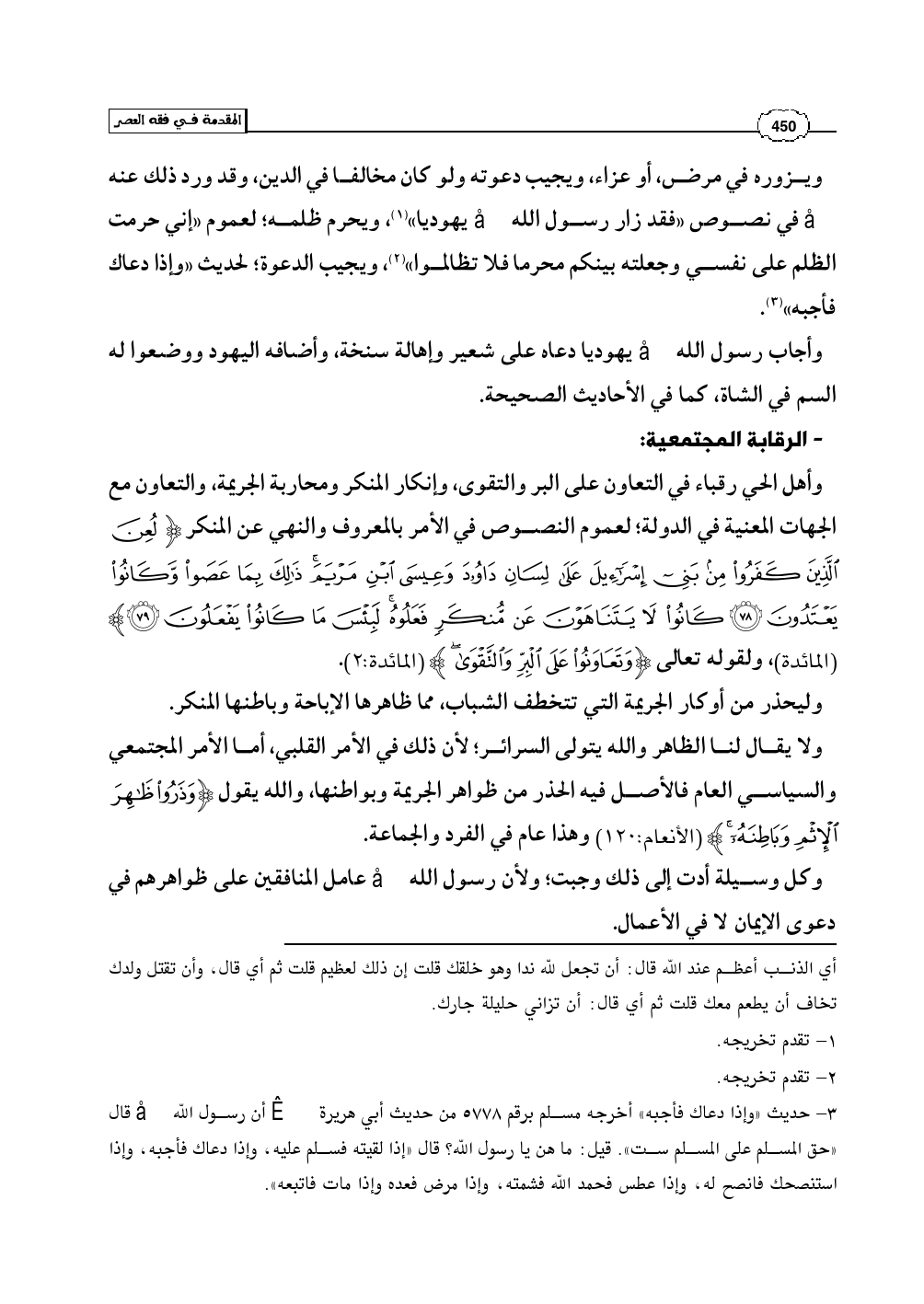 وأهل الحي رقباء في التعاون على البر والتقوى، وإنكار المنكر ومحاربة الجريمة، والتعاون مع الجهات المعنية في الدولة؛ لعموم النصوص في الأمر بالمعروف والنهي عن المنكر (لُعِنَ الَّذِينَ كَفَرُوا مِن بَنِي إِسْرَائِيلَ عَلَى لِسَانِ دَاوُودَ وَعِيسَى ابْنِ مَرْيَمَ ذَلِكَ بِمَا عَصَوا وَّكَانُوا يَعْتَدُونَ (78) كَانُوا لاَ يَتَنَاهَوْنَ عَن مُّنكَرٍ فَعَلُوهُ لَبِئْسَ مَا كَانُوا يَفْعَلُونَ) (المائدة: 78 - 79)، ولقوله تعالى (وَتَعَاوَنُوا عَلَى الْبرِّ وَالتَّقْوَى) (المائدة: 2).