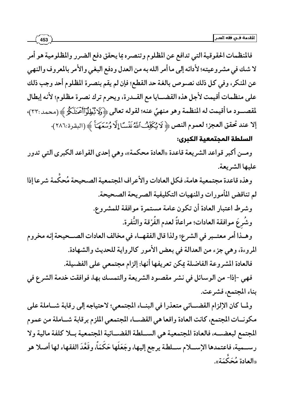 ولما كان الإلزام القضائي متعذرا في البناء المجتمعي؛ لاحتياجه إلى رقابة شاملة على مكونات المجتمع، كانت العادة واقعا هي القضاء المجتمعي الملزم برقابة شاملة من عموم المجتمع لبعضه، فالعادة المجتمعية هي السلطة القضائية المجتمعية بلا كلفة مالية ولا رسمية، فاعتمدها الإسلام سلطة يرجع إليها، وجَعَلَها حَكَمَاً، وقَعَّدَ الفقهاء لها أصلا هو «العادة مُحَكَّمَة».