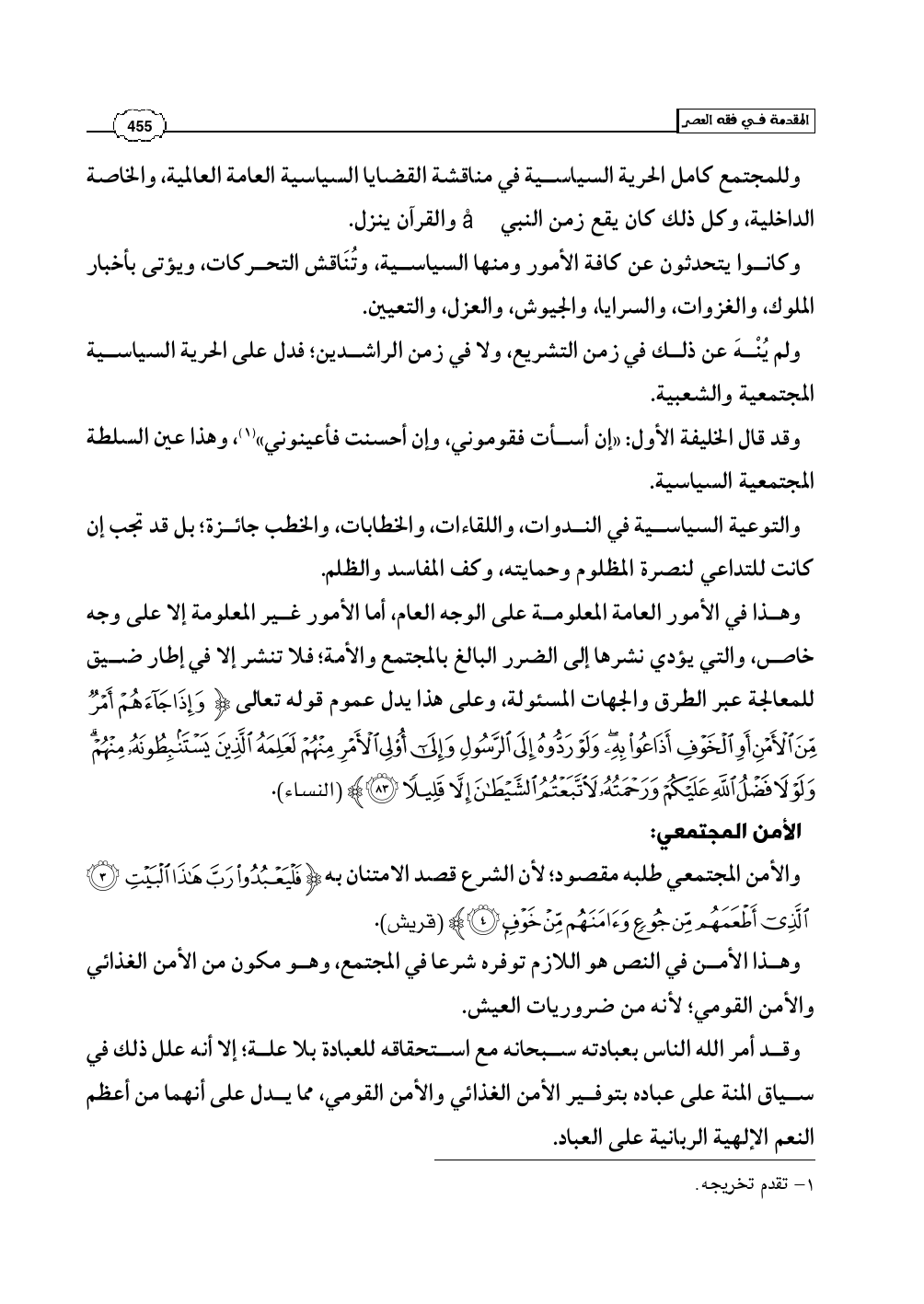 وللمجتمع كامل الحرية السياسية في مناقشة القضايا السياسية العامة العالمية، والخاصة الداخلية، وكل ذلك كان يقع زمن النبي صلى الله عليه وسلم والقرآن ينزل.