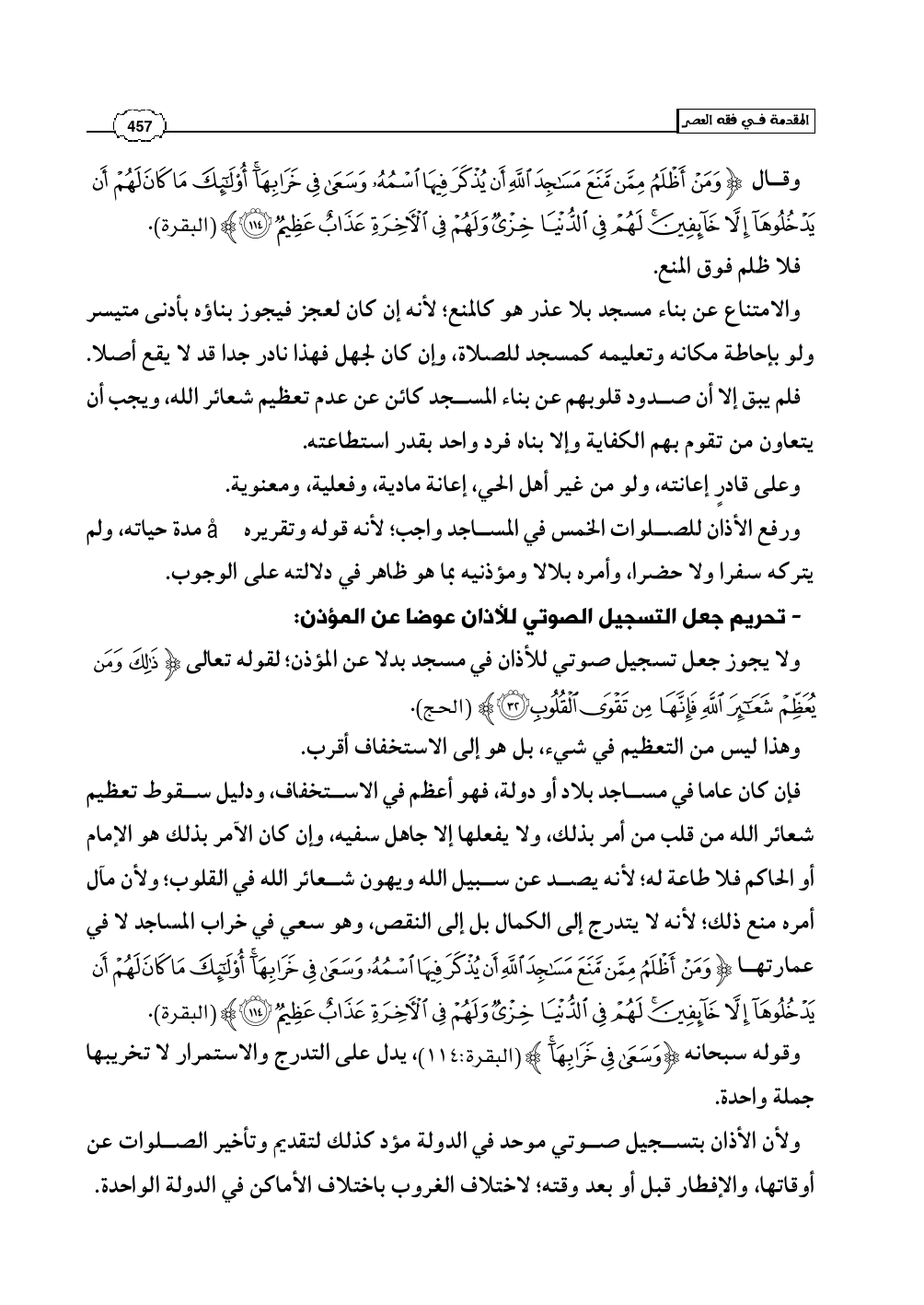 فإن كان عاما في مساجد بلاد أو دولة، فهو أعظم في الاستخفاف، ودليل سقوط تعظيم شعائر الله من قلب من أمر بذلك، ولا يفعلها إلا جاهل سفيه، وإن كان الآمر بذلك هو الإمام أو الحاكم فلا طاعة له؛ لأنه يصد عن سبيل الله ويهون شعائر الله في القلوب؛ ولأن مآل أمره منع ذلك؛ لأنه لا يتدرج إلى الكمال بل إلى النقص، وهو سعي في خراب المساجد لا في عمارتها (وَمَنْ أَظْلَمُ مِمَّن مَّنَعَ مَسَاجِدَ اللَّهِ أَن يُذْكَرَ فِيهَا اسْمُهُ وَسَعَى فِي خَرَابِهَا أُوْلَئِكَ مَا كَانَ لَهُمْ أَن يَدْخُلُوهَا إِلاَّ خَآئِفِينَ لهُمْ فِي الدُّنْيَا خِزْيٌ وَلَهُمْ فِي الآخِرَةِ عَذَابٌ عَظِيمٌ) (البقرة: 114).