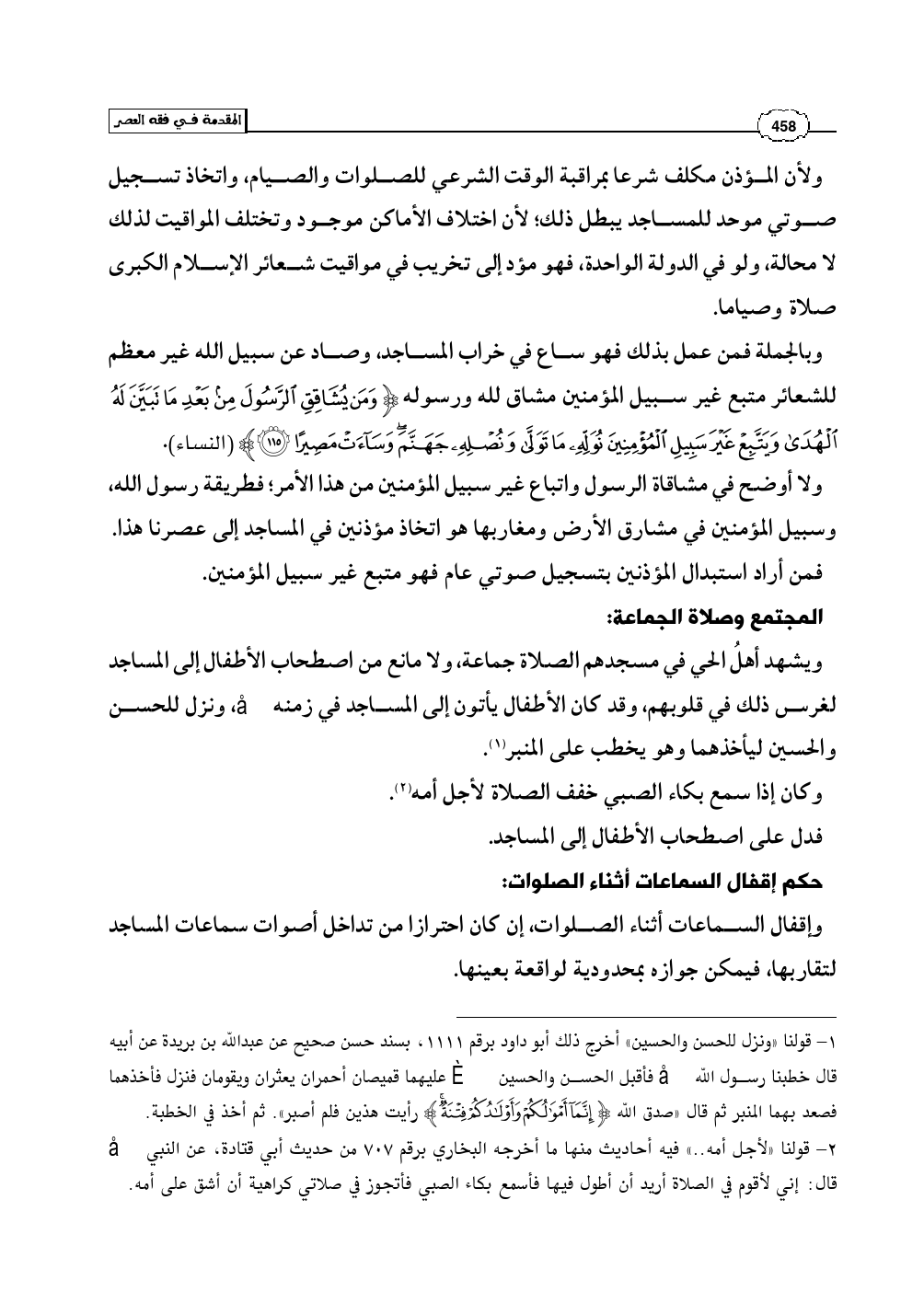 ولا أوضح في مشاقاة الرسول واتباع غير سبيل المؤمنين من هذا الأمر؛ فطريقة رسول الله، وسبيل المؤمنين في مشارق الأرض ومغاربها هو اتخاذ مؤذنين في المساجد إلى عصرنا هذا.