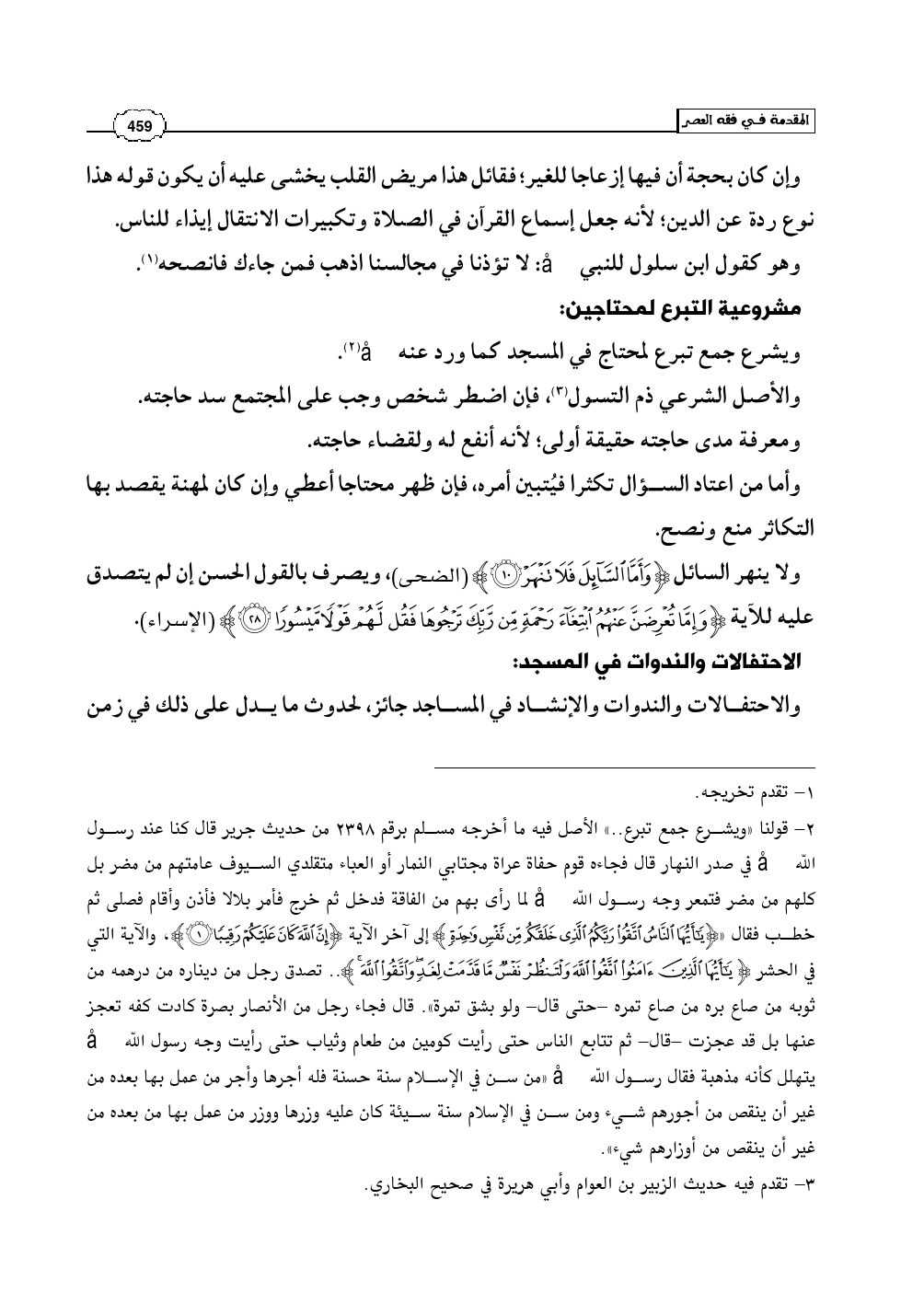 (¬2) - قولنا «ويشرع جمع تبرع .. » الأصل فيه ما أخرجه مسلم برقم 2398 من حديث جرير قال كنا عند رسول الله صلى الله عليه وسلم في صدر النهار قال فجاءه قوم حفاة عراة مجتابي النمار أو العباء متقلدي السيوف عامتهم من مضر بل كلهم من مضر فتمعر وجه رسول الله صلى الله عليه وسلم لما رأى بهم من الفاقة فدخل ثم خرج فأمر بلالا فأذن وأقام فصلى ثم خطب فقال «(يَا أَيُّهَا النَّاسُ اتَّقُوا رَبَّكُمُ الَّذِي خَلَقَكُم مِّن نَّفْسٍ وَاحِدَةٍ) إلى آخر الآية (إِنَّ اللَّهَ كَانَ عَلَيْكُمْ رَقِيبًا)، والآية التي في الحشر (يَا أَيُّهَا الَّذِينَ آمَنُوا اتَّقُوا اللَّهَ وَلْتَنظُرْ نَفْسٌ مَّا قَدَّمَتْ لِغَدٍ) .. تصدق رجل من ديناره من درهمه من ثوبه من صاع بره من صاع تمره -حتى قال- ولو بشق تمرة». قال فجاء رجل من الأنصار بصرة كادت كفه تعجز عنها بل قد عجزت -قال- ثم تتابع الناس حتى رأيت كومين من طعام وثياب حتى رأيت وجه رسول الله صلى الله عليه وسلم يتهلل كأنه مذهبة فقال رسول الله صلى الله عليه وسلم «من سن في الإسلام سنة حسنة فله أجرها وأجر من عمل بها بعده من غير أن ينقص من أجورهم شيء ومن سن في الإسلام سنة سيئة كان عليه وزرها ووزر من عمل بها من بعده من غير أن ينقص من أوزارهم شيء».
