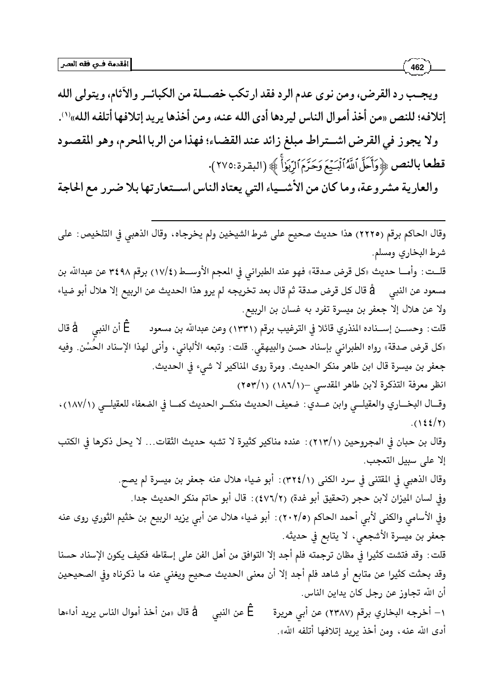 قلت: وحسن إسناده المنذري قائلا في الترغيب برقم (1331) وعن عبدالله بن مسعود رضي الله عنه أن النبي صلى الله عليه وسلم قال «كل قرض صدقة» رواه الطبراني بإسناد حسن والبيهقي. قلت: وتبعه الألباني، وأنى لهذا الإسناد الحُسْن. وفيه جعفر بن ميسرة قال ابن طاهر منكر الحديث. ومرة روى المناكير لا شيء في الحديث.