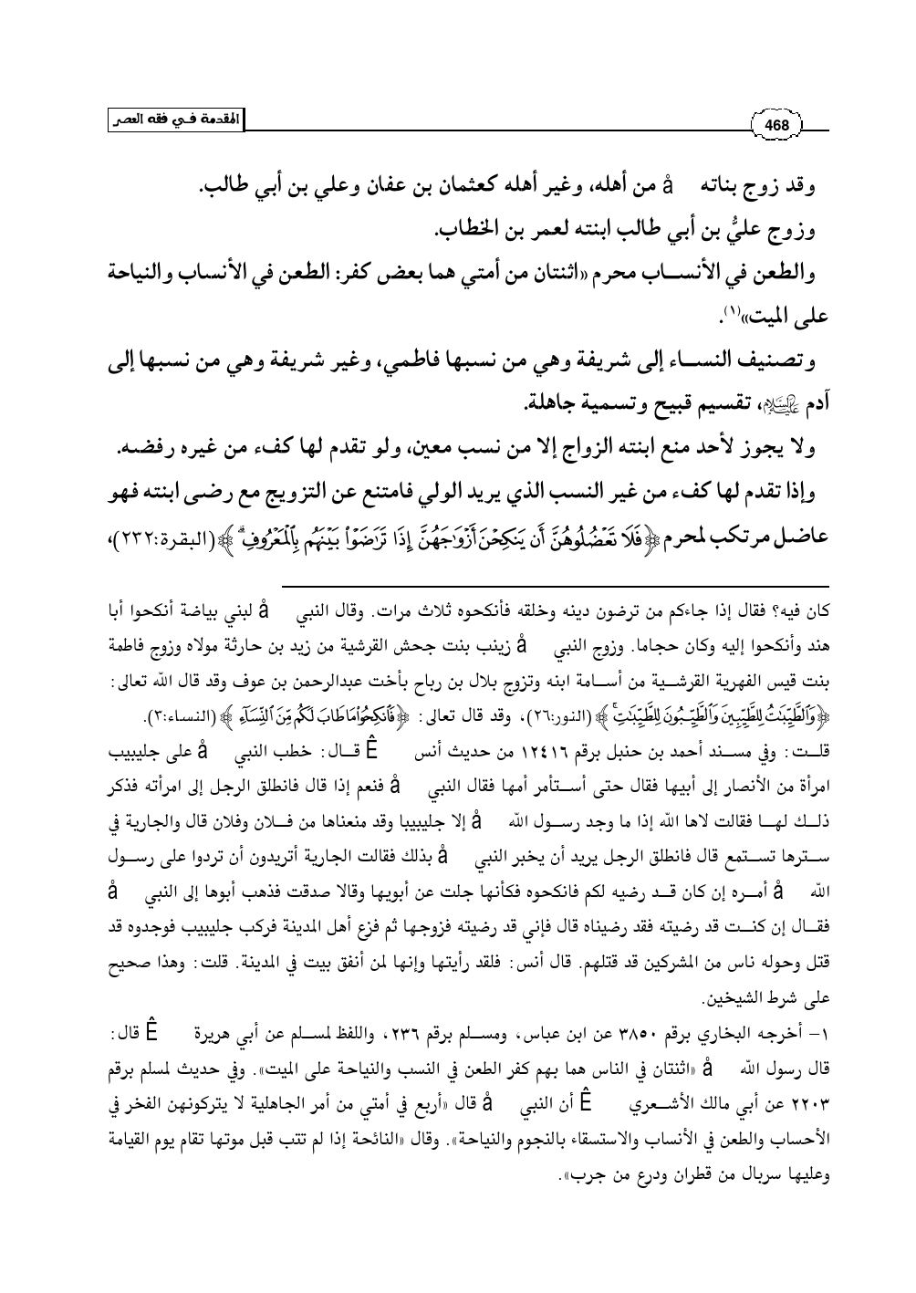 = كان فيه؟ فقال إذا جاءكم من ترضون دينه وخلقه فأنكحوه ثلاث مرات. وقال النبي صلى الله عليه وسلم لبني بياضة أنكحوا أبا هند وأنكحوا إليه وكان حجاما. وزوج النبي صلى الله عليه وسلم زينب بنت جحش القرشية من زيد بن حارثة مولاه وزوج فاطمة بنت قيس الفهرية القرشية من أسامة ابنه وتزوج بلال بن رباح بأخت عبدالرحمن بن عوف وقد قال الله تعالى: (وَالطَّيِّبَاتُ لِلطَّيِّبِينَ وَالطَّيِّبُونَ لِلطَّيِّبَاتِ) (النور: 26)، وقد قال تعالى: (فَانكِحُوا مَا طَابَ لَكُم مِّنَ النِّسَاء) (النساء: 3).