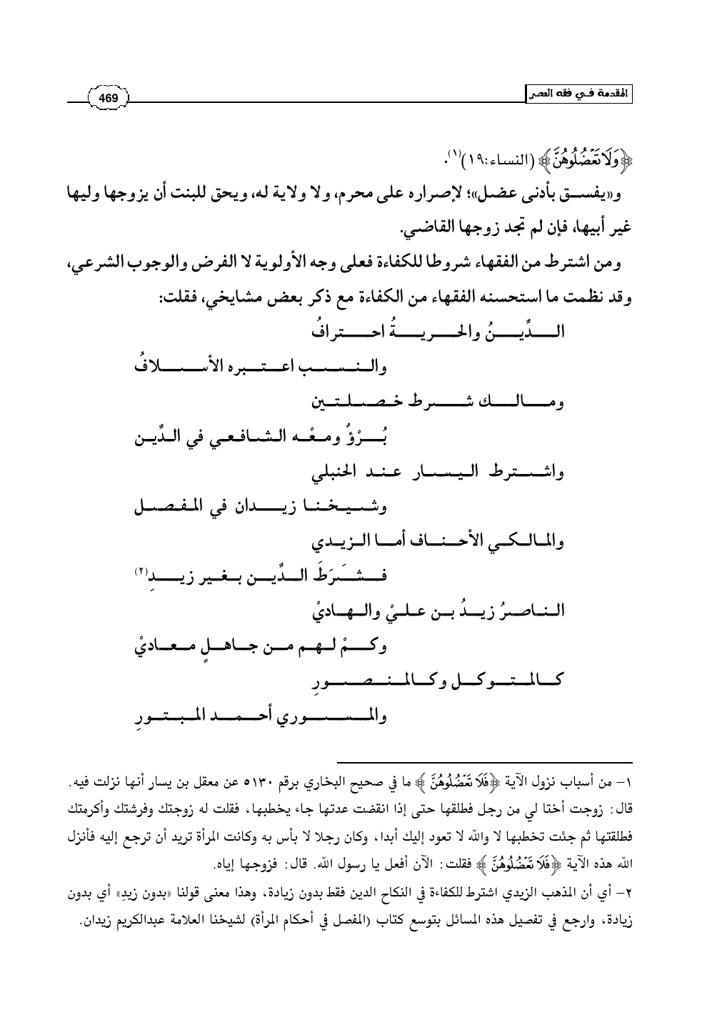 (¬2) - أي أن المذهب الزيدي اشترط للكفاءة في النكاح الدين فقط بدون زيادة، وهذا معنى قولنا «بدون زيدِ» أي بدون زيادة، وارجع في تفصيل هذه المسائل بتوسع كتاب (المفصل في أحكام المرأة) لشيخنا العلامة عبدالكريم زيدان.