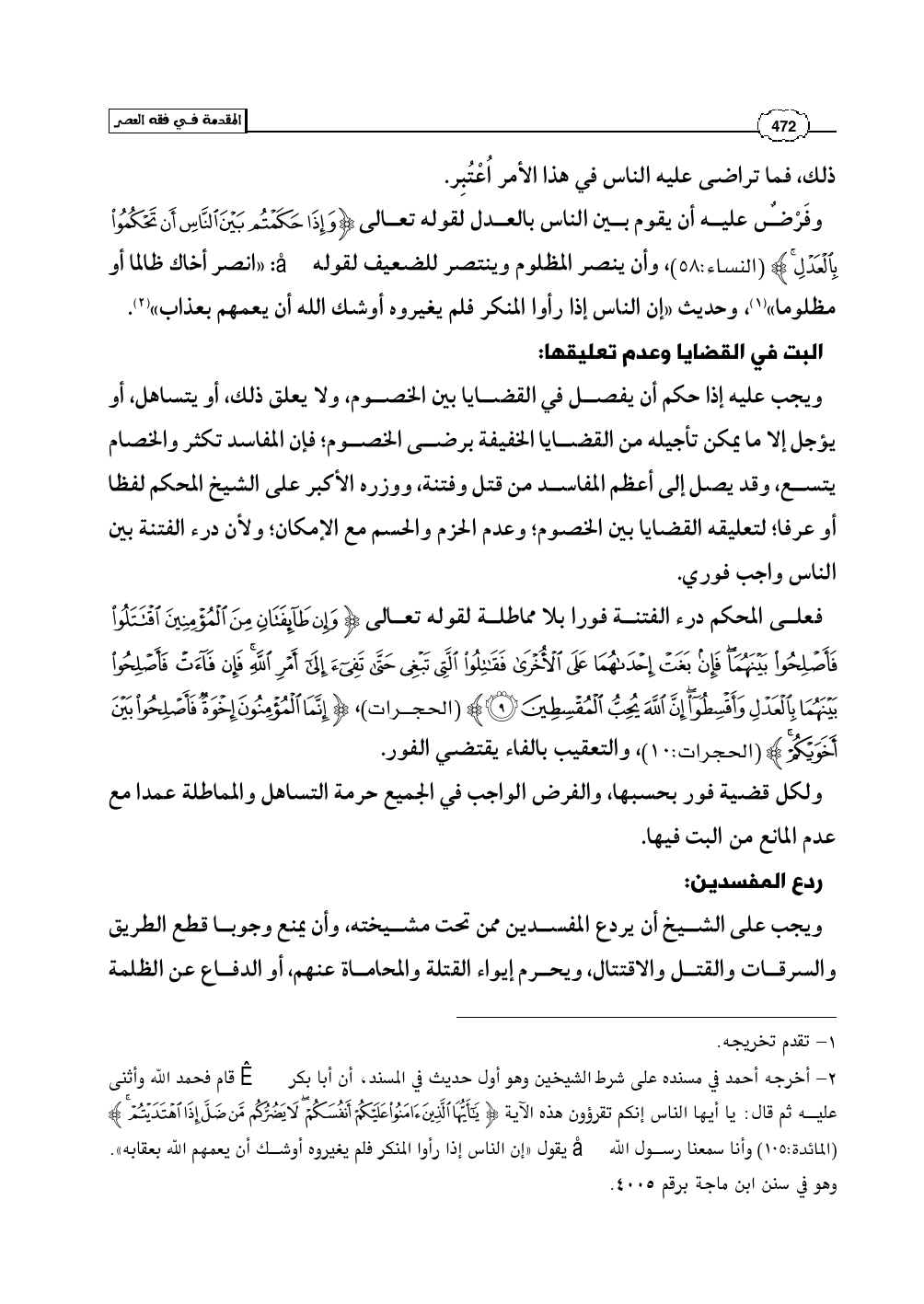 وفَرْضٌ عليه أن يقوم بين الناس بالعدل لقوله تعالى (وَإِذَا حَكَمْتُم بَيْنَ النَّاسِ أَن تَحْكُمُوا بِالْعَدْلِ) (النساء: 58)، وأن ينصر المظلوم وينتصر للضعيف لقوله صلى الله عليه وسلم: «انصر أخاك ظالما أو مظلوما» (¬1)، وحديث «إن الناس إذا رأوا المنكر فلم يغيروه أوشك الله أن يعمهم بعذاب» (¬2).
