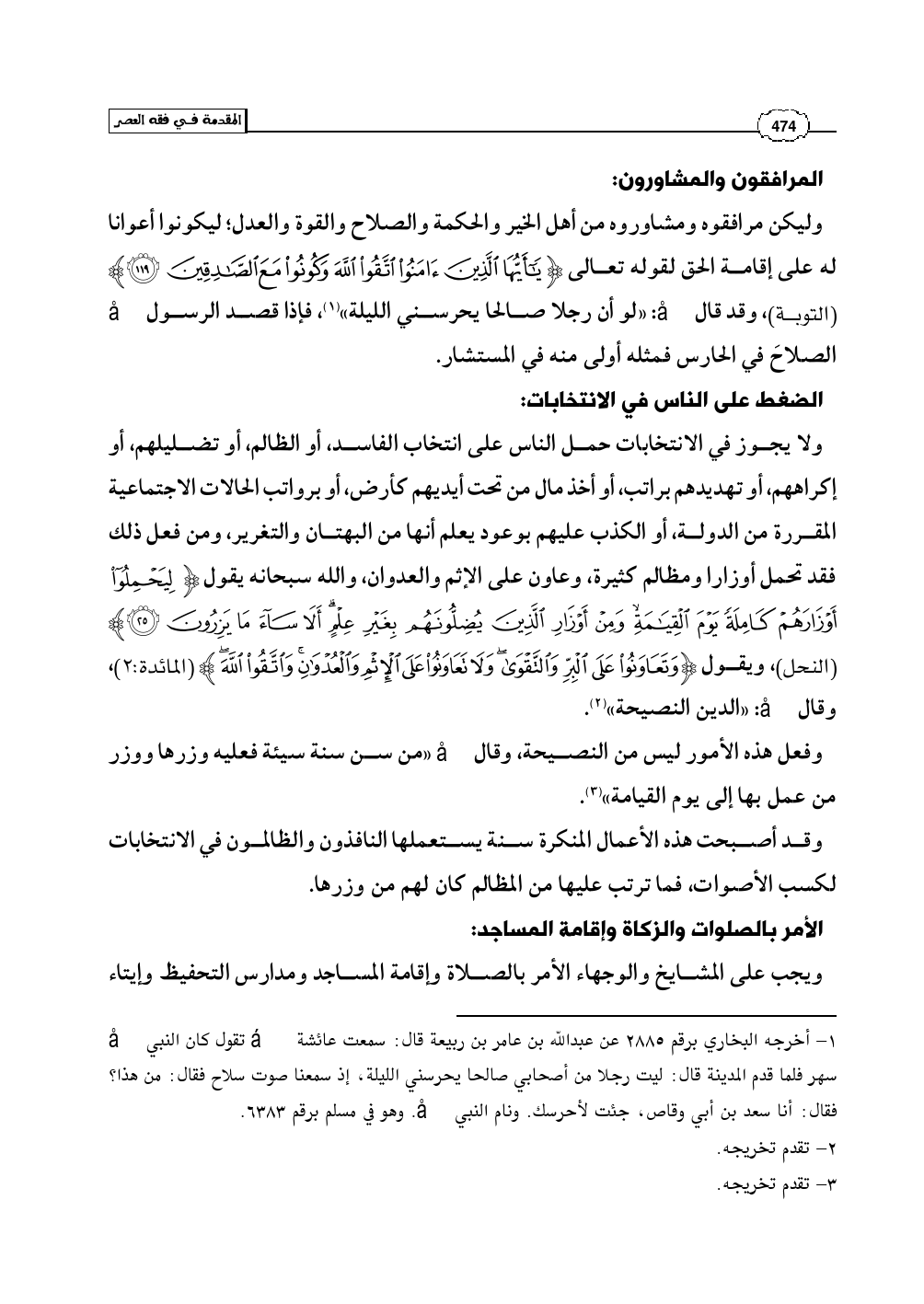 وليكن مرافقوه ومشاوروه من أهل الخير والحكمة والصلاح والقوة والعدل؛ ليكونوا أعوانا له على إقامة الحق لقوله تعالى (يَا أَيُّهَا الَّذِينَ آمَنُوا اتَّقُوا اللَّهَ وَكُونُوا مَعَ الصَّادِقِينَ) (التوبة: 119)، وقد قال صلى الله عليه وسلم: «لو أن رجلا صالحا يحرسني الليلة» (¬1)، فإذا قصد الرسول صلى الله عليه وسلم الصلاحَ في الحارس فمثله أولى منه في المستشار.