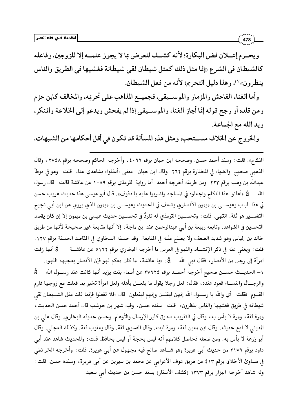 وأما الغناء الفاحش والمزمار والموسيقى، فجميع المذاهب على تحريمه، والمخالف كابن حزم ومن قلده أو رجح قوله إنما أجاز الغناء والموسيقى إذا لم يفحش ويدعو إلى الخلاعة والمنكر، ويد الله مع الجماعة.