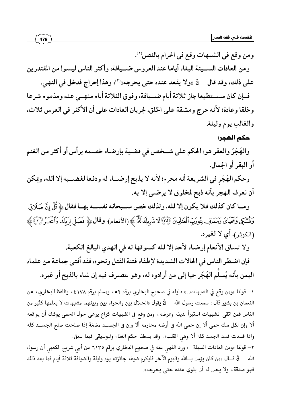 (¬1) - قولنا «ومن وقع في الشبهات .. » دليله في صحيح البخاري برقم 52، ومسلم برقم 4178، واللفظ للبخاري، عن النعمان بن بشير قال: سمعت رسول الله صلى الله عليه وسلم يقول «الحلال بين والحرام بين وبينهما مشبهات لا يعلمها كثير من الناس فمن اتقى المشبهات استبرأ لدينه وعرضه، ومن وقع في الشبهات كراع يرعى حول الحمى يوشك أن يواقعه ألا وإن لكل ملك حمى ألا إن حمى الله في أرضه محارمه ألا وإن في الجسد مضغة إذا صلحت صلح الجسد كله وإذا فسدت فسد الجسد كله ألا وهي القلب». وقد بسطنا حكم الغناء والموسيقى فيما سبق.
