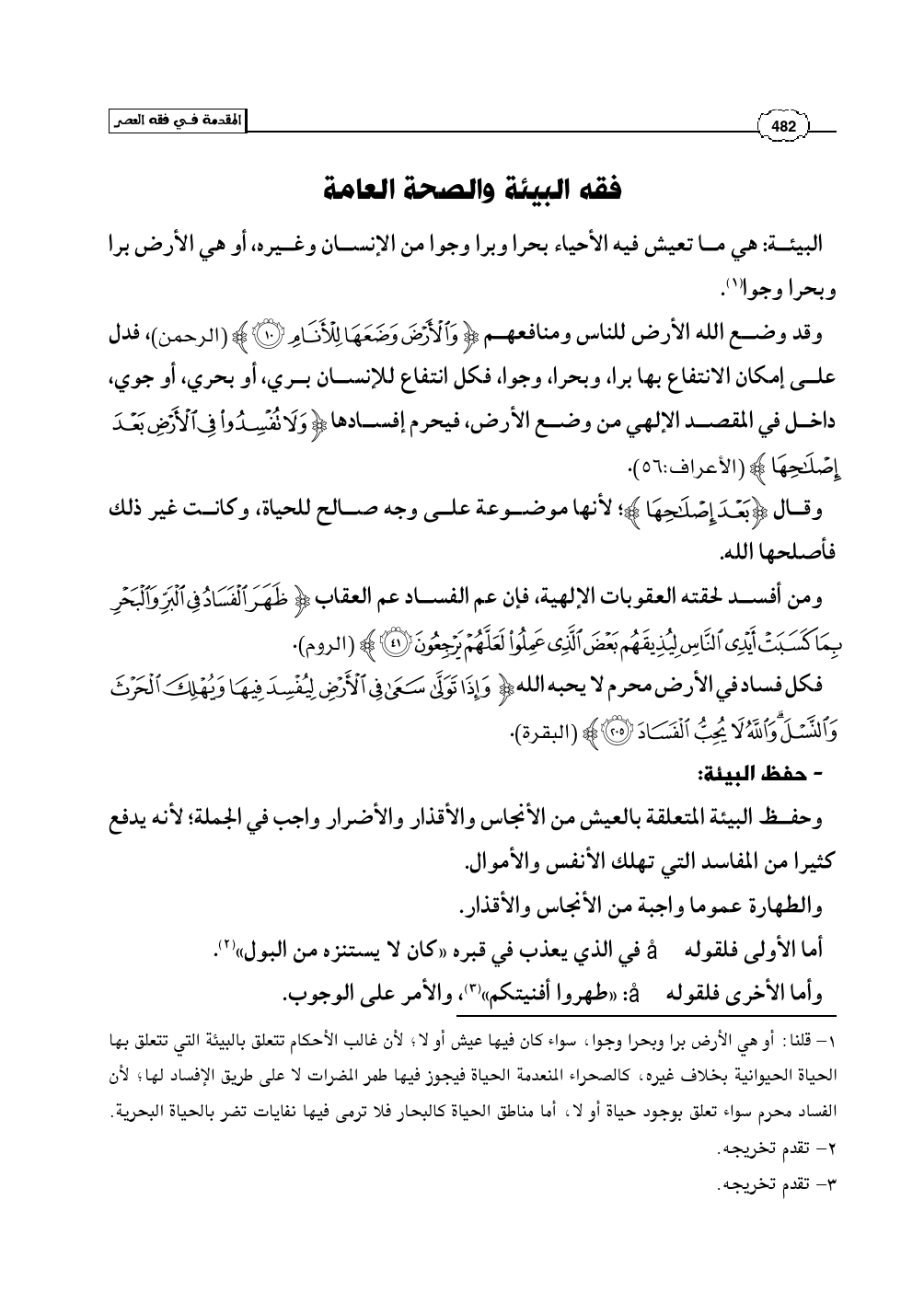 (¬1) - قلنا: أو هي الأرض برا وبحرا وجوا، سواء كان فيها عيش أو لا؛ لأن غالب الأحكام تتعلق بالبيئة التي تتعلق بها الحياة الحيوانية بخلاف غيره، كالصحراء المنعدمة الحياة فيجوز فيها طمر المضرات لا على طريق الإفساد لها؛ لأن الفساد محرم سواء تعلق بوجود حياة أو لا، أما مناطق الحياة كالبحار فلا ترمى فيها نفايات تضر بالحياة البحرية.
