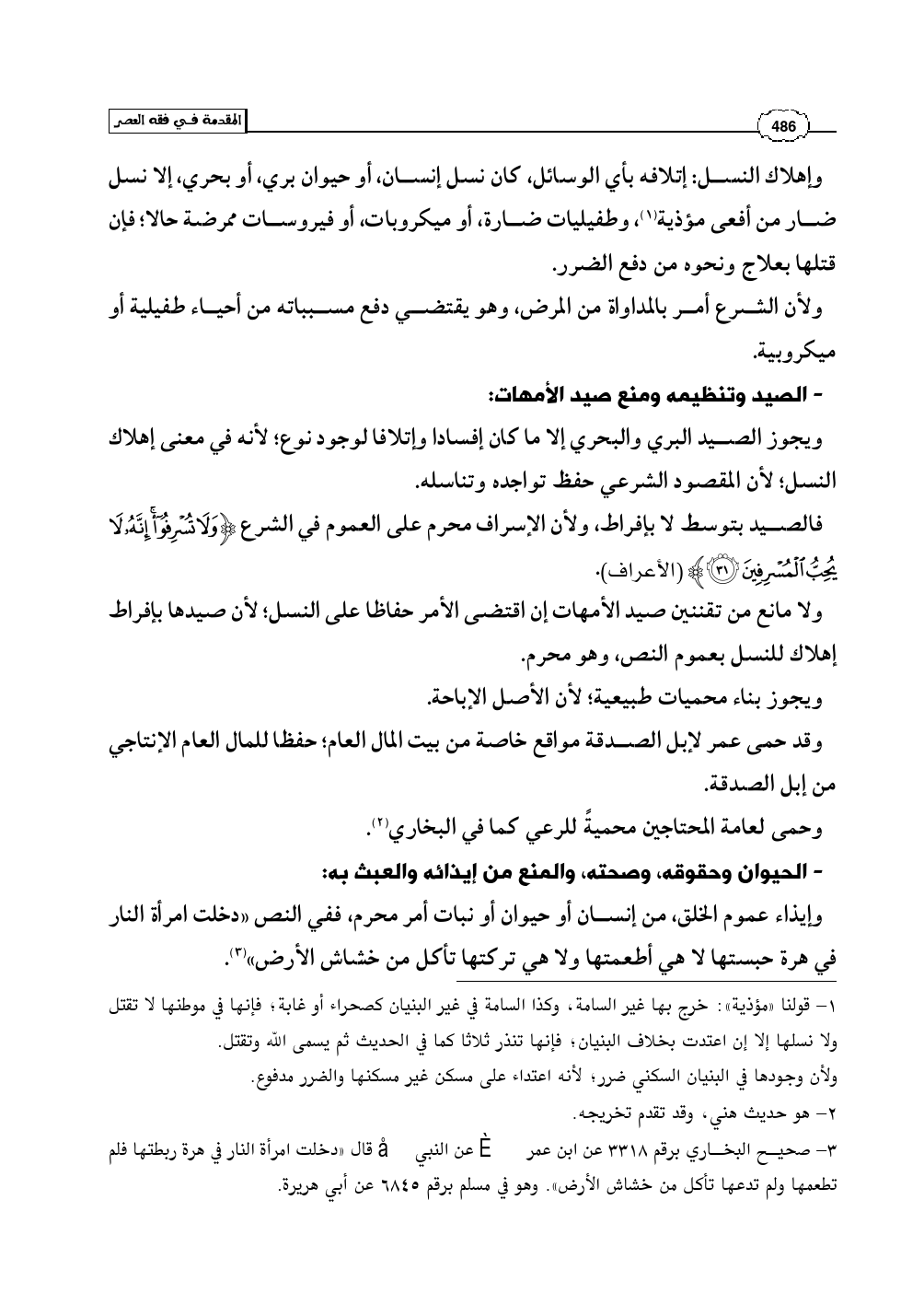 وإهلاك النسل: إتلافه بأي الوسائل، كان نسل إنسان، أو حيوان بري، أو بحري، إلا نسل ضار من أفعى مؤذية (¬1)، وطفيليات ضارة، أو ميكروبات، أو فيروسات ممرضة حالا؛ فإن قتلها بعلاج ونحوه من دفع الضرر.