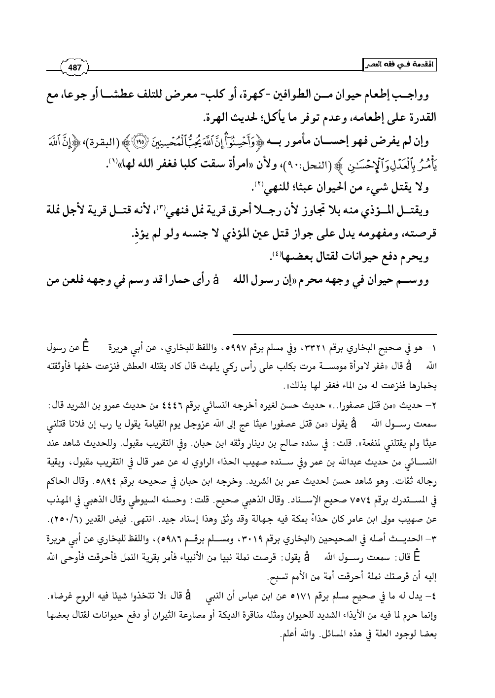 (¬2) - حديث «من قتل عصفورا .. » حديث حسن لغيره أخرجه النسائي برقم 4446 من حديث عمرو بن الشريد قال: سمعت رسول الله صلى الله عليه وسلم يقول «من قتل عصفورا عبثا عج إلى الله عزوجل يوم القيامة يقول يا رب إن فلانا قتلني عبثا ولم يقتلني لمنفعة». قلت: في سنده صالح بن دينار وثقه ابن حبان. وفي التقريب مقبول. وللحديث شاهد عند النسائي من حديث عبدالله بن عمر وفي سنده صهيب الحذاء الراوي له عن عمر قال في التقريب مقبول، وبقية رجاله ثقات. وهو شاهد حسن لحديث عمر بن الشريد. وخرجه ابن حبان في صحيحه برقم 5894. وقال الحاكم في المستدرك برقم 7574 صحيح الإسناد. وقال الذهبي صحيح. قلت: وحسنه السيوطي وقال الذهبي في المهذب عن صهيب مولى ابن عامر كان حذاءً بمكة فيه جهالة وقد وثق وهذا إسناد جيد. انتهى. فيض القدير (6/ 250).