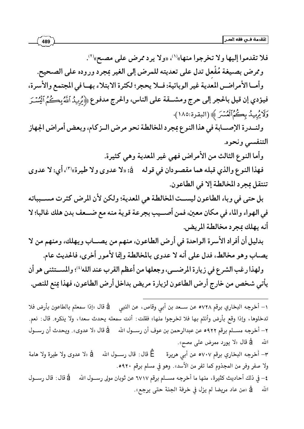 فلا تقدموا إليها ولا تخرجوا منها» (¬1)، «ولا يرد ممرض على مصح» (¬2).