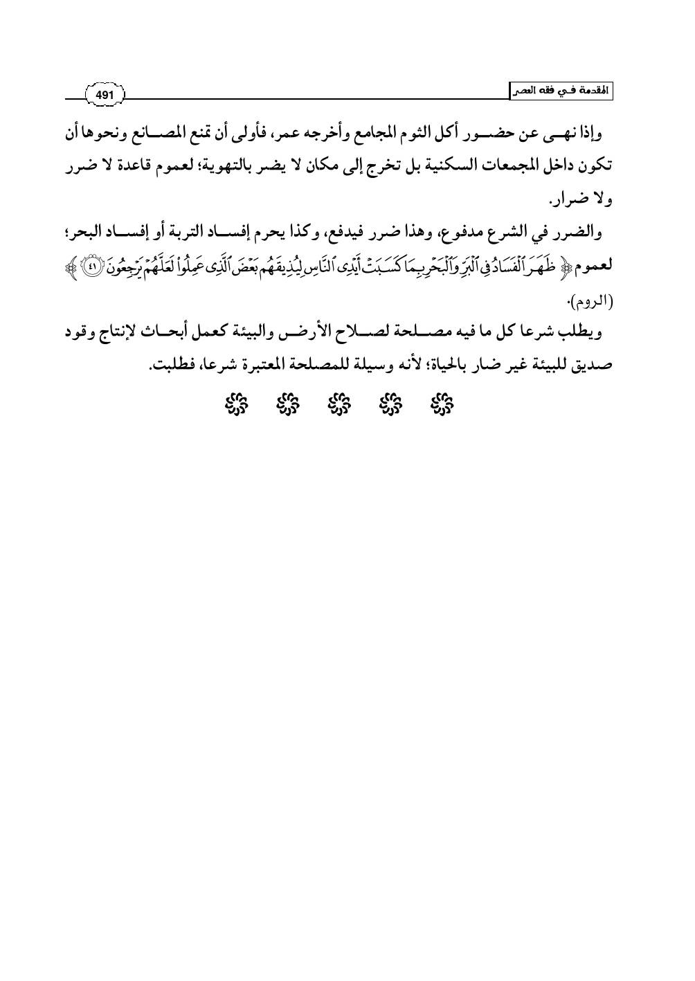 وإذا نهى عن حضور أكل الثوم المجامع وأخرجه عمر، فأولى أن تمنع المصانع ونحوها أن تكون داخل المجمعات السكنية بل تخرج إلى مكان لا يضر بالتهوية؛ لعموم قاعدة لا ضرر ولا ضرار.