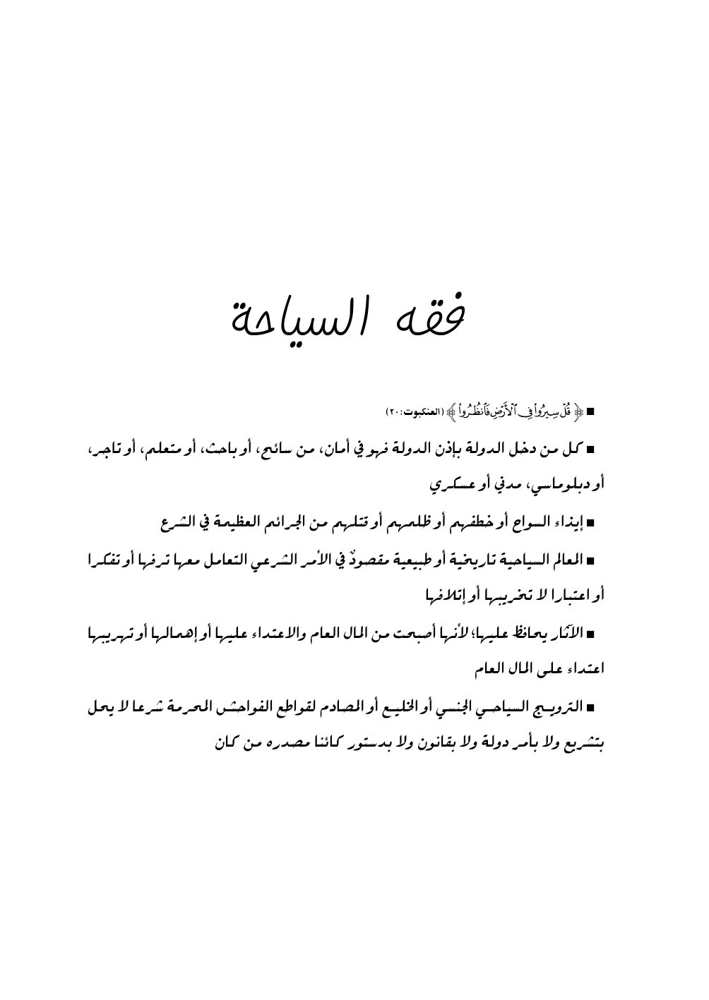 * الترويج السياحي الجنسي أو الخليع أو المصادم لقواطع الفواحش المحرمة شرعا لا يحل بتشريع ولا بأمر دولة ولا بقانون ولا بدستور كائنا مصدره من كان
