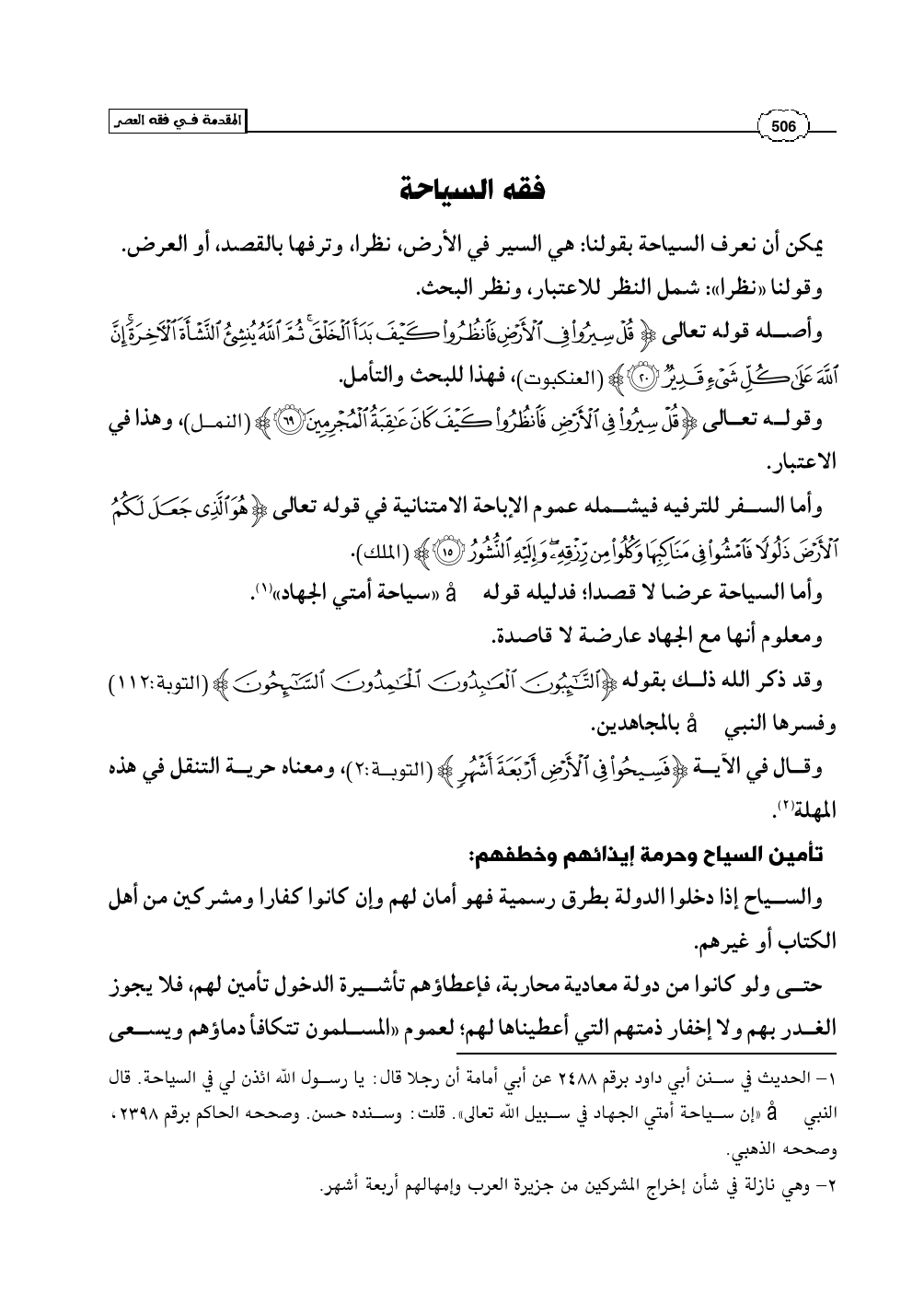 (¬1) - الحديث في سنن أبي داود برقم 2488 عن أبي أمامة أن رجلا قال: يا رسول الله ائذن لي في السياحة. قال النبي صلى الله عليه وسلم «إن سياحة أمتي الجهاد في سبيل الله تعالى». قلت: وسنده حسن. وصححه الحاكم برقم 2398، وصححه الذهبي.