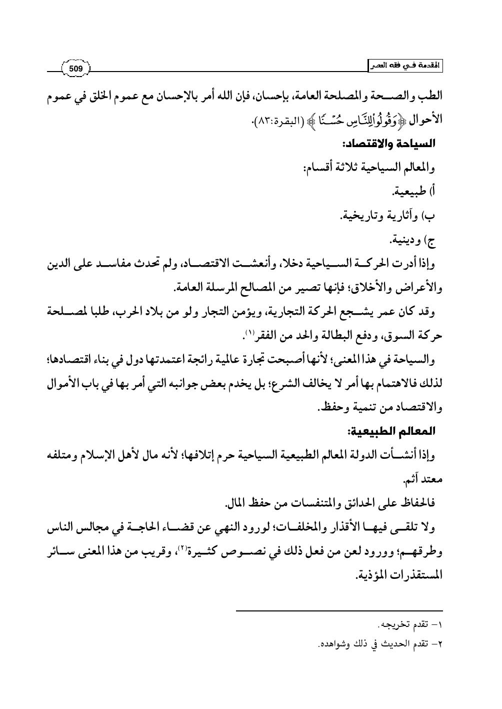 والسياحة في هذا المعنى؛ لأنها أصبحت تجارة عالمية رائجة اعتمدتها دول في بناء اقتصادها؛ لذلك فالاهتمام بها أمر لا يخالف الشرع؛ بل يخدم بعض جوانبه التي أمر بها في باب الأموال والاقتصاد من تنمية وحفظ.