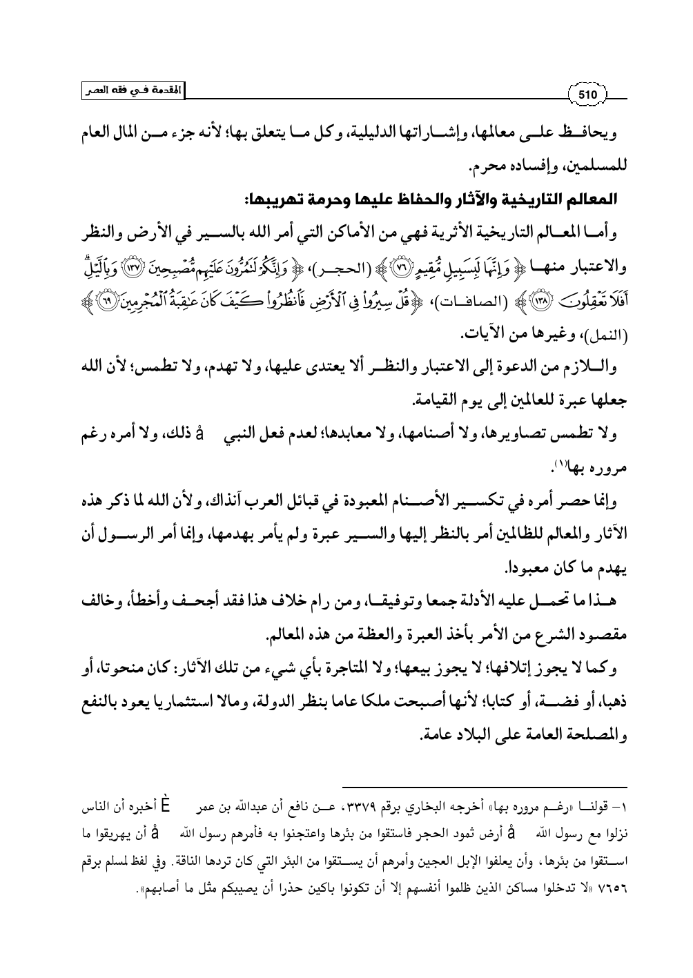 (¬1) - قولنا «رغم مروره بها» أخرجه البخاري برقم 3379، عن نافع أن عبدالله بن عمر رضي الله عنهما أخبره أن الناس نزلوا مع رسول الله صلى الله عليه وسلم أرض ثمود الحجر فاستقوا من بئرها واعتجنوا به فأمرهم رسول الله صلى الله عليه وسلم أن يهريقوا ما استقوا من بئرها، وأن يعلفوا الإبل العجين وأمرهم أن يستقوا من البئر التي كان تردها الناقة. وفي لفظ لمسلم برقم 7656 «لا تدخلوا مساكن الذين ظلموا أنفسهم إلا أن تكونوا باكين حذرا أن يصيبكم مثل ما أصابهم».