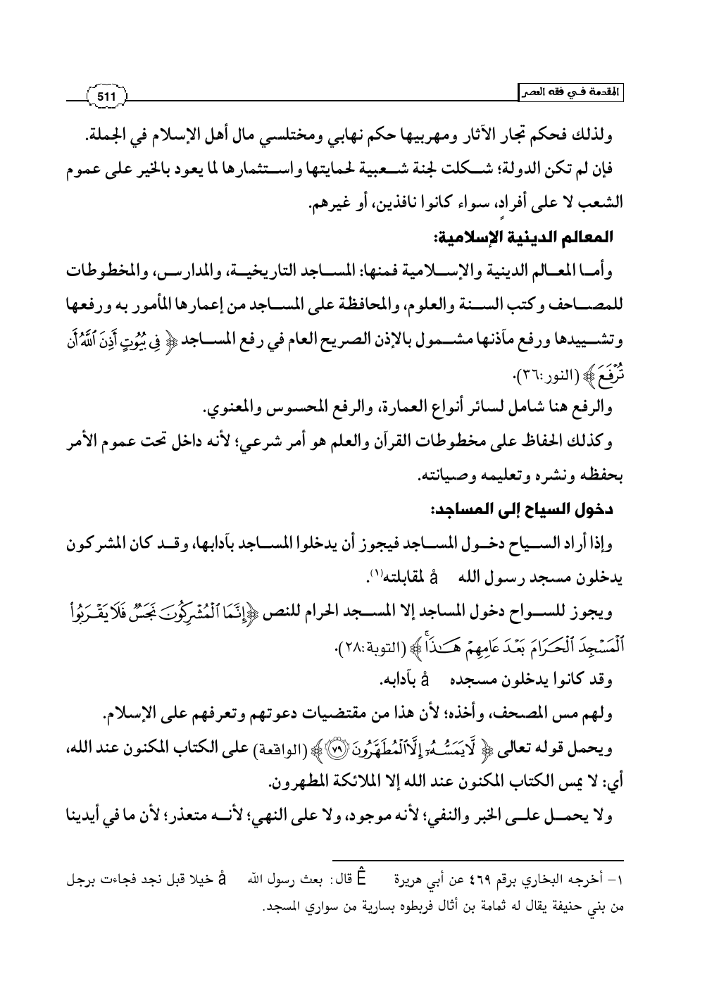 وأما المعالم الدينية والإسلامية فمنها: المساجد التاريخية، والمدارس، والمخطوطات للمصاحف وكتب السنة والعلوم، والمحافظة على المساجد من إعمارها المأمور به ورفعها وتشييدها ورفع مآذنها مشمول بالإذن الصريح العام في رفع المساجد (فِي بُيُوتٍ أَذِنَ اللَّهُ أَن تُرْفَعَ) (النور: 36).