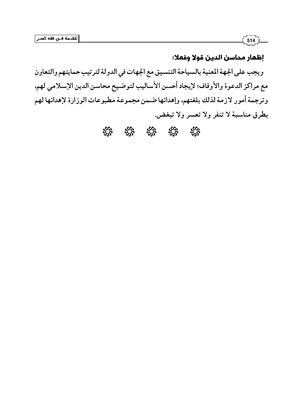 ويجب على الجهة المعنية بالسياحة التنسيق مع الجهات في الدولة لترتيب حمايتهم والتعاون مع مراكز الدعوة والأوقاف؛ لإيجاد أحسن الأساليب لتوضيح محاسن الدين الإسلامي لهم، وترجمة أمور لازمة لذلك بلغتهم، وإهدائها ضمن مجموعة مطبوعات الوزارة لإهدائها لهم بطرق مناسبة لا تنفر ولا تعسر ولا تبغض.