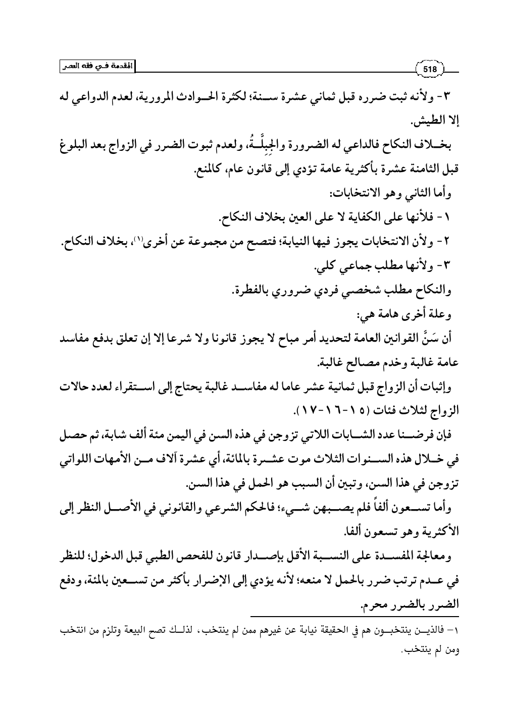 بخلاف النكاح فالداعي له الضرورة والجِبِلَّةُ، ولعدم ثبوت الضرر في الزواج بعد البلوغ قبل الثامنة عشرة بأكثرية عامة تؤدي إلى قانون عام، كالمنع.