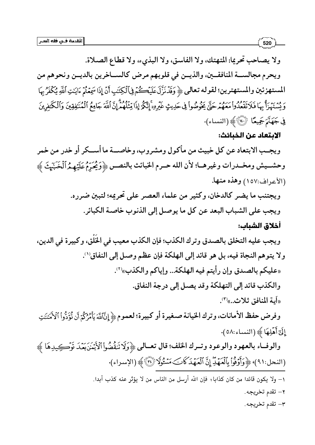 ولا يصاحب تحريما: المتهتك، ولا الفاسق، ولا البذيء، ولا قطاع الصلاة.